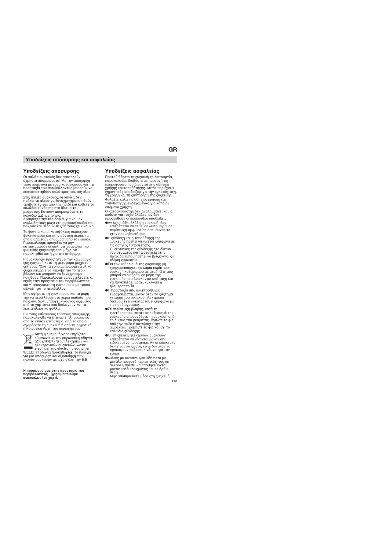 Υποδείξεις απσυρσης και ασφαλείας Υποδείξεις απσυρσης Οι παλιέσ συσκευέσ δεν αποτελούν άχρηστα απορρίµµατα! Με την απσυρσή τουσ σύµφωνα µε τουσ κανονισµούσ για την προστασία του περιβάλλοντοσ µπορούν να επαναποκτηθούν πολύτιµεσ πρώτεσ ύλεσ. Στισ παλιέσ συσκευέσ, οι οποίεσ δεν πρκειται πλέον να ξαναχρησιµοποιηθούν, τραβάτε το φισ απ την πρίζα και κβετε το καλώδιο σύνδεσησ στο δίκτυο του ρεύµατοσ. Κατπιν αποµακρύνετε το καλώδιο µαζί µε το φισ. Αφαιρέστε την κλειδαριά, για να µην εγκλωβιστούν µέσα στη συσκευή παιδιά που παίζουν και θέσουν τη ζωή τουσ σε κίνδυνο. Τα ψυγεία και οι καταψύκτεσ περιέχουν ψυκτικά µέσα και στην µνωση αέρια, τα οποία απαιτούν απσυρση απ τον ειδικ. Παρακαλούµε προσέξτε να µην καταστραφούν οι σωληνωτοί αγωγοί τησ ψυκτικήσ συσκευήσ σασ, µέχρι να παραληφθεί αυτή για την απσυρση. Η συσκευασία προστατεύει την καινούργια σασ συσκευή κατά τη µεταφορά µέχρι το σπίτι σασ. λα τα χρησιµοποιούµενα υλικά συσκευασίασ είναι αβλαβή για το περι- βάλλον και µπορούν να ξαναχρησιµο- ποιηθούν. Παρακαλούµε να συντελέσετε κι εσείσ στην προστασία του περιβάλλοντοσ και ν' αποσύρετε τη συσκευασία µε τρπο αβλαβή για το περιβάλλον. Μην αφήσετε τη συσκευασία και τα µέρη τησ να περιέλθουν στα χέρια παιδιών που παίζουν, διτι υπάρχει κίνδυνοσ ασφυξίασ απ τα χαρτνια που διπλώνουν και τα λεπτά πλαστικά φύλλα. Για τουσ επίκαιρουσ τρπουσ απσυρσησ παρακαλείσθε να ζητήσετε πληροφορίεσ απ το ειδικ κατάστηµα, απ το οποίο αγοράσατε τη συσκευή ή απ τη ∆ηµοτική ή Κοινοτική Αρχή τησ περιοχήσ σασ. Aυτή η συσκευή χαρακτηρίζεται σύµφωνα µε την ευρωπαϊκη οδηγια (2002/96/EK) περί ηλεκτρικών και ηλεκτρονικών συσκευών (waste electrical and electronic equipment WEEE). H οδηγία προκαθορίζει τα πλαίσια για µια απσυρση και αξιοποίηση των παλιών συσκευών µε ισχύ σ’λη την E.E. Η προσφορά µας στην προστασία του περιβάλλοντος – χρησιµοποιούµε ανακυκλωµένο χαρτί. Υποδείξεις ασφαλείας Προτού θέσετε τη συσκευή σε λειτουργία, παρακαλούµε διαβάστε µε προσοχή τισ πληροφορίεσ που δίνονται στισ οδηγίεσ χρήσησ και τοποθέτησησ. Αυτέσ περιέχουν σηµαντικέσ υποδείξεισ για την εγκατάσταση, τη χρήση και τη συντήρηση τησ συσκευήσ. Φυλάξτε καλά τισ οδηγίεσ χρήσησ και τοποθέτησησ ενδεχοµένωσ για κάποιον επµενο χρήστη. Ο κατασκευαστήσ δεν αναλαµβάνει καµία ευθύνη για τυχν βλάβεσ, αν δεν προσεχθούν οι ακλουθεσ υποδείξεισ: l Αν έχει πάθει βλάβη η συσκευή, δεν επιτρέπεται να τεθεί σε λειτουργία, σε περίπτωση αµφιβολίασ απευθυνθείτε στον προµηθευτή σασ. l Η σύνδεση και η τοποθέτηση τησ συσκευήσ πρέπει να γίνεται σύµφωνα µε τισ οδηγίεσ τοποθέτησησ. Οι συνθήκεσ τησ σύνδεσησ στο δίκτυο του ρεύµατοσ και τα στοιχεία στην πινακίδα τύπου πρέπει να βρίσκονται σε πλήρη συµφωνία. l Για τον καθαρισµ τησ συσκευήσ µη χρησιµοποιήσετε σε καµιά περίπτωση συσκευή καθαρισµού µε ατµ. Ο ατµσ µπορεί να εισέρθει σε µέρη τησ συσκευήσ που βρίσκονται υπ τάση και να προκαλέσει βραχυκύκλωµα ή ηλεκτροπληξία. l Η προστασία απ ηλεκτροπληξία εξασφαλίζεται, µνον ταν το σύστηµα γείωσησ του οικιακού ηλεκτρικού δικτύου έχει εγκατασταθεί σύµφωνα µε τισ προδιαγραφέσ. l Σε περίπτωση βλάβησ, κατά τη συντήρηση και κατά τον καθαρισµ τησ συσκευήσ αποσυνδέστε τη συσκευή απ το δίκτυο του ρεύµατοσ. Βγάλτε το φισ απ την πρίζα ή κατεβάστε την ασφάλεια. Τραβήξτε το φισ και χι το καλώδιο σύνδεσησ. l Οι επισκευέσ ηλεκτρικών συσκευών επιτρέπεται να γίνο