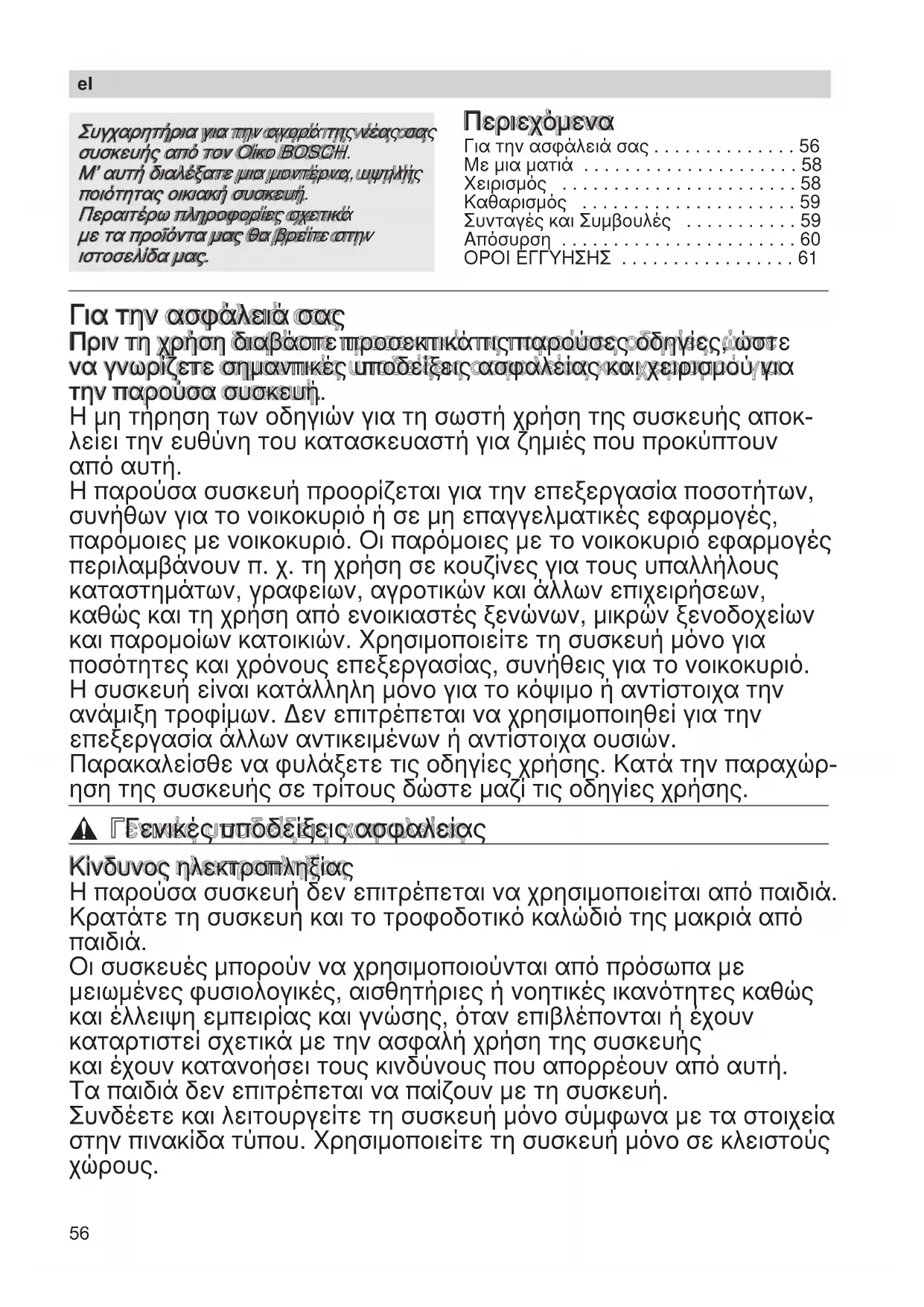 - ΟΡΟΙ ΕΓΓΥΗΣΗΣ Για την ασφάλειά σας Πριν τη χρήση διαβάστε προσεκτικά τις παρούσες οδηγίες, ώστε να γνωρίζετε σημαντικές υποδείξεις ασφαλείας και χειρισμού για την παρούσα συσκευή. Η μη τήρηση των οδηγιών για τη σωστή χρήση της συσκευής αποκ- λείει την ευθύνη του κατασκευαστή για ζημιές που προκύπτουν p. 61