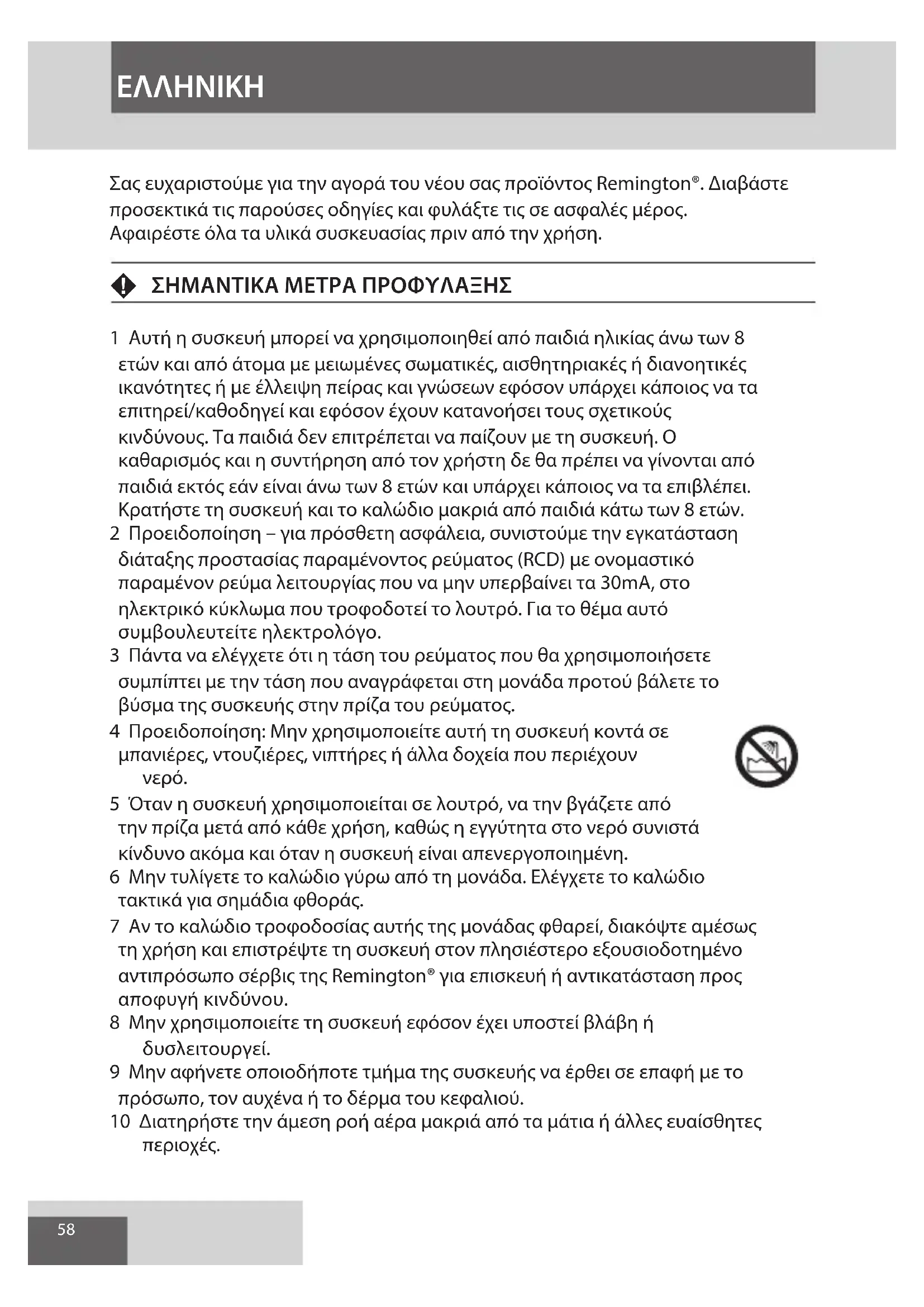 Σaç ευχαριστούμε γία την αγορά του θέου σας προίόντος Remington®. Διαβάστε προσεκτικά τις παρούσες ήθηγίες και φυλάξτε τις σε ασφαλές μέρος. Αφαρεότε ὄλα ταῦλίκα συοκευασίας πριν από την χρήση.