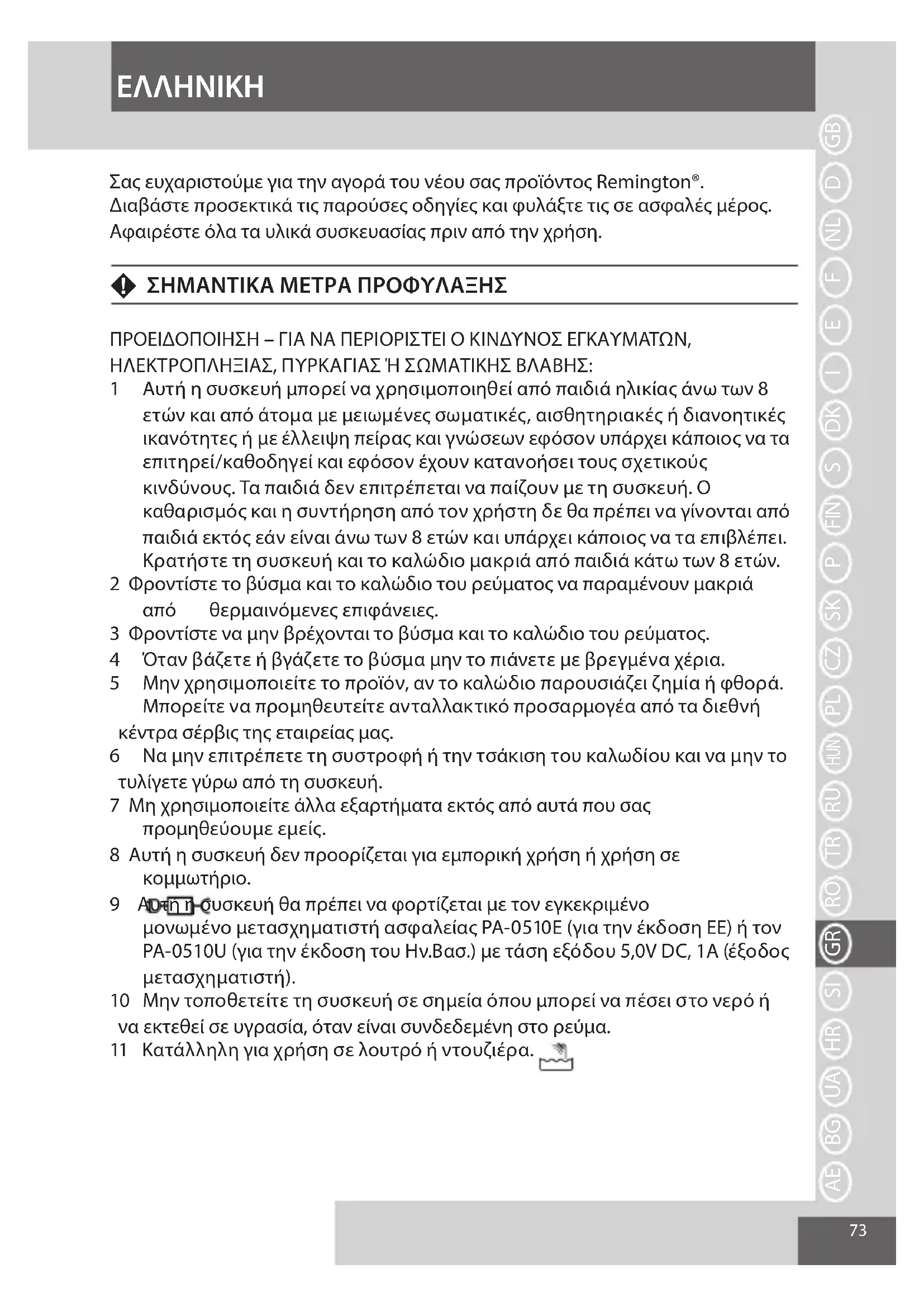 - Η μπαταρία μπορεί να απορριφθεί με ασφάλεια. H ΠΕΡΙΒΑΛΛΟΝΤΙΚΗ ΠΡΟΣΤΑΣΙΑ Προς αποφυγή των επιπτώσεων στο περιβάλλον και την υγεία εξαιτίας των επικίνδυνων ουσιών σε ηλεκτρικά και ηλεκτρονικά αγαθά, οι συσκευές που έχουν σημανθεί με αυτό το σύμβολο δε θα πρέπει να απορρίπτονται μαζί με αταξινόμητα δημοτικά απόβλητα, αλλά να εντάσσονται σε διαδικασίες ανάκτησης, επαναχρησιμοποιήσης ή ανακύκλωσης. EΛΛHNIKH GBDNLFEIDKSFINPSKCZ HUN PLRUTRROGRSIBG HRUAAE78 Zahvaljujemo se vam za nakup novega izdelka Remington®. Prosimo, da skrbno preberete ta navodila in jih varno shranite. Pred uporabo odstranite vso embalažo.