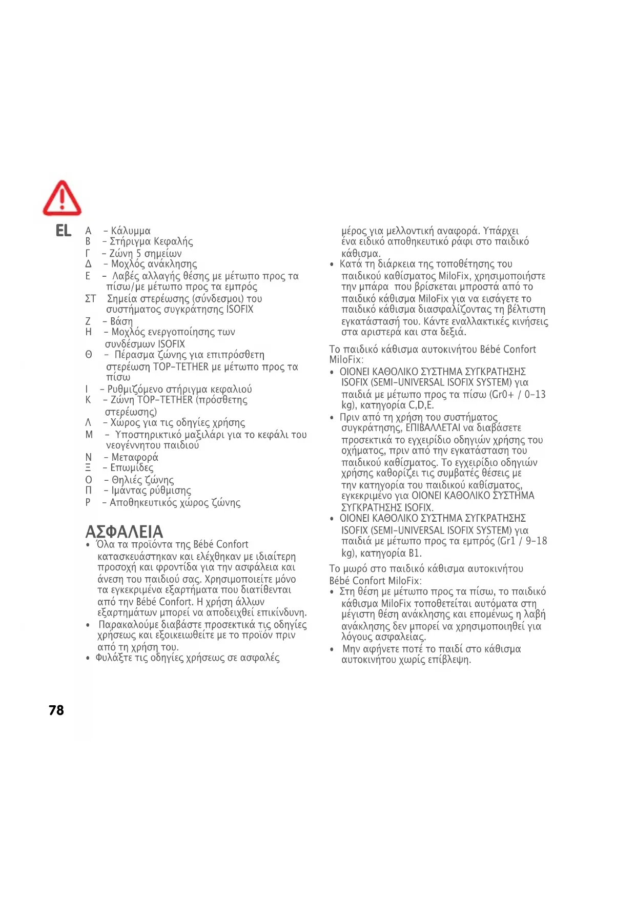 στηνπερίπτωσητουσυστήματοςαγκύρωσης ISOFIX,ηχρήσηςτωνάγκιστρωνγιακατώτερη αγκίστρωσηστοόχημαδενείναιεπαρκής. Είναιαπαραίτητονασυνδέσετετηζώνη πρόσθετηςστερέωσης“TopTether”στοανώτερο σημείοαγκύρωσηςπουσυνιστάταιαπότην κατασκευάστριαεταιρείατουαυτοκινήτου. Ηεγκατάστασητουπαιδικούκαθίσματος MiloFixμετιςζώνεςπρόσθετηςστερέωσης χρησιμοποιώνταςταεπιπρόσθετασημεία αγκύρωσηςISOFIX. Τασημείαστερέωσηςτουσυστήματος συγκράτησηςISOFIXδημιουργήθηκανγιατην απόκτησημιαςεύκοληςκαιασφαλούςστερέωσης τωνπαιδικώνσυστημάτωνασφαλείαςεντός τουαυτοκινήτου.Δενείναιόλατααυτοκίνητα εξοπλισμέναμετασημείαστερέωσηςανκαι είναιτυποποιημένασταπιοπρόσφαταμοντέλα. Συμβουλευτείτετονκατάλογοτωναυτοκινήτων προκειμένουναελέγξετεσεποιοόχημαμπορεί ναεγκατασταθείτοπαιδικόκάθισμα(μπορείτε επίσηςνασυμβουλευτείτετιςεπιπρόσθετες ενημερώσειςπουέχουνγίνειστονκατάλογοκαι διατίθενταιαπότηνιστοσελίδαμας www.bebeconfort.com).