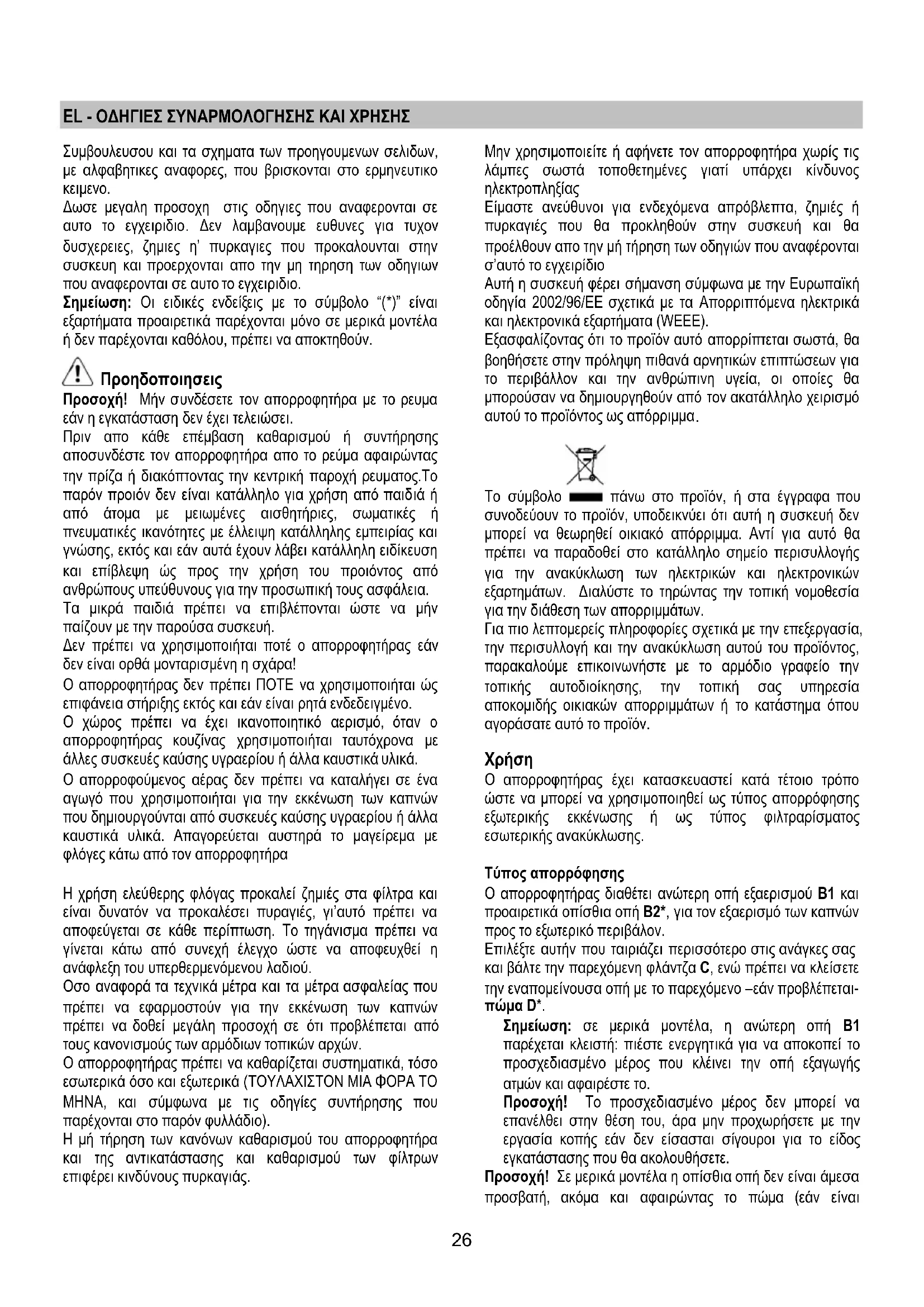 Ο απορροφούμενος αέρας δεν πρέπει να καταλήγει σε ένα αγωγό που χρησιμοποιήται για την εκκένωση των καπνών που δημιουργούνται από συσκευές καύσης υγραερίου ή άλλα καυστικά υλικά. Απαγορεύεται αυστηρά το μαγείρεμα με φλόγες κάτω από τον απορροφητήρα Η χρήση ελεύθερης φλόγας προκαλεί ζημιές στα φίλτρα και είναι δυνατόν να προκαλέσει πυραγιές, γι’αυτό πρέπει να αποφεύγεται σε κάθε περίπτωση. Το τηγάνισμα πρέπει να γίνεται κάτω από συνεχή έλεγχο ώστε να αποφευχθεί η ανάφλεξη του υπερθερμενόμενου λαδιού. Οσο αναφορά τα τεχνικά μέτρα και τα μέτρα ασφαλείας που πρέπει να εφαρμοστούν για την εκκένωση των καπνών πρέπει να δοθεί μεγάλη προσοχή σε ότι προβλέπεται από τους κανονισμούς των αρμόδιων τοπικών αρχών. Ο απορροφητήρας πρέπει να καθαρίζεται συστηματικά, τόσο εσωτερικά όσο και εξωτερικά (ΤΟΥΛΑΧΙΣΤΟΝ ΜΙΑ ΦΟΡΑ ΤΟ ΜΗΝΑ, και σύμφωνα με τις οδηγίες συντήρησης που παρέχονται στο παρόν φυλλάδιο). Η μή τήρηση των κανόνων καθαρισμού του απορροφητήρα και της αντικατάστασης και καθαρισμού των φίλτρων επιφέρει κινδύνους πυρκαγιάς. Μην χρησιμοποιείτε ή αφήνετε τον απορροφητήρα χωρίς τις λάμπες σωστά τοποθετημένες γιατί υπάρχει κίνδυνος ηλεκτροπληξίας Είμαστε ανεύθυνοι για ενδεχόμενα απρόβλεπτα, ζημιές ή πυρκαγιές που θα προκληθούν στην συσκευή και θα προέλθουν απο την μή τήρηση των οδηγιών που αναφέρονται σ’αυτό το εγχειρίδιο Αυτή η συσκευή φέρει σήμανση σύμφωνα με την Ευρωπαϊκή οδηγία 2002/96/ΕΕ σχετικά με τα Απορριπτόμενα ηλεκτρικά και ηλεκτρονικά εξαρτήματα (WEEE). Εξασφαλίζοντας ότι το προϊόν αυτό απορρίπτεται σωστά, θα βοηθήσετε στην πρόληψη πιθανά αρνητικών επιπτώσεων για το περιβάλλον και την ανθρώπινη υγεία, οι οποίες θα μπορούσαν να δημιουργηθούν από τον ακατάλληλο χειρισμό αυτού το προϊόντος ως απόρριμμα
