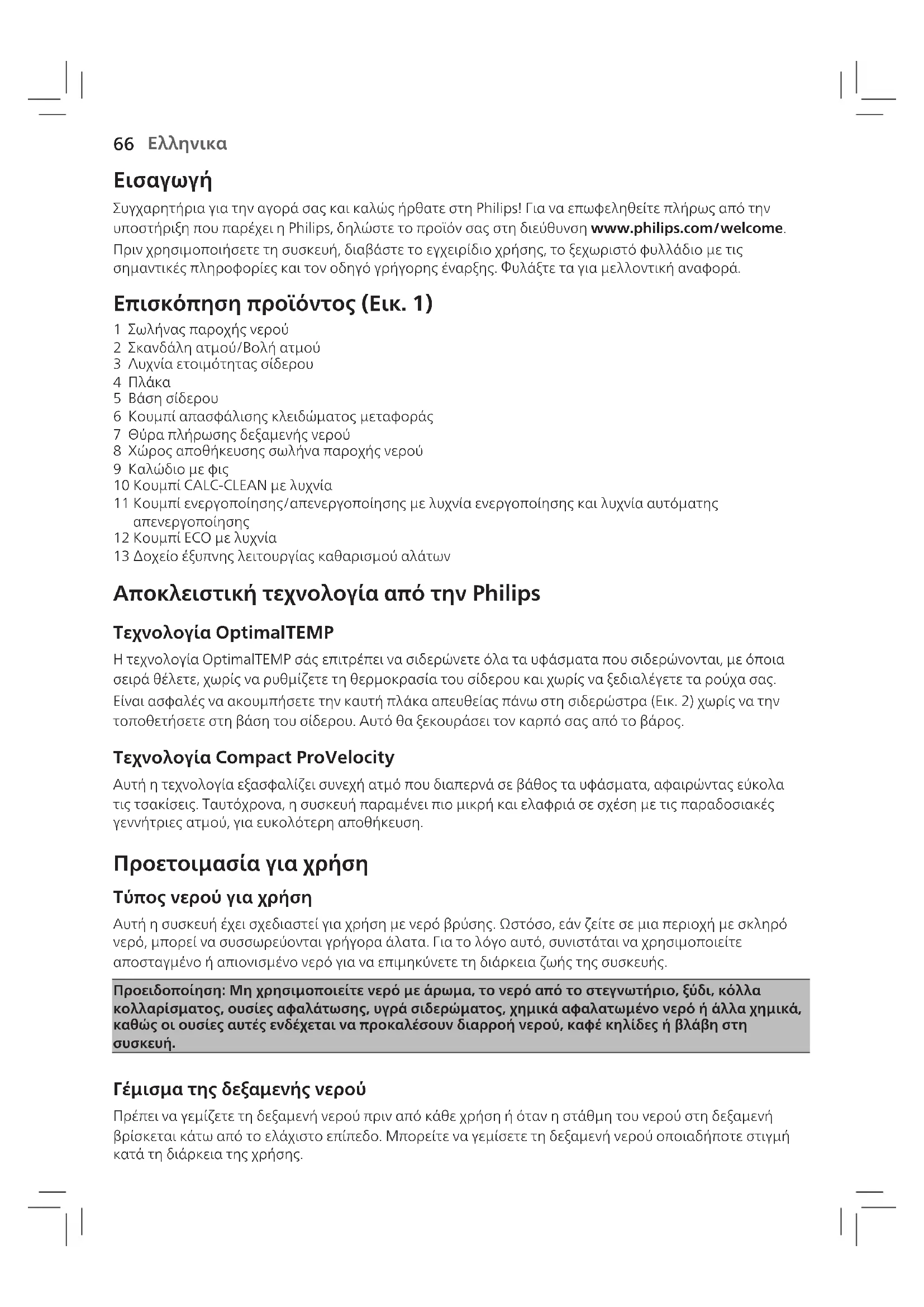 Συγχαρητήρια για την αγορά σας και καλώς ήρθατε στη Philips! Για να επωφεληθείτε πλήρως από την υποστήριξη που παρέχει η Philips, δηλώστε το προϊόν σας στη διεύθυνση www.philips.com/welcome. Πριν χρησιμοποιήσετε τη συσκευή, διαβάστε το εγχειρίδιο χρήσης, το ξεχωριστό φυλλάδιο με τις σημαντικές πληροφορίες και τον οδηγό γρήγορης έναρξης. Φυλάξτε τα για μελλοντική αναφορά. Επισκόπηση προϊόντος (Εικ. 1) 1 Σωλήνας παροχής νερού 2 Σκανδάλη ατμού/Βολή ατμού 3 Λυχνία ετοιμότητας σίδερου 4 Πλάκα 5 Βάση σίδερου 6 Κουμπί απασφάλισης κλειδώματος μεταφοράς 7 Θύρα πλήρωσης δεξαμενής νερού 8 Χώρος αποθήκευσης σωλήνα παροχής νερού 9 Καλώδιο με φις 10 Κουμπί CALC-CLEAN με λυχνία 11 Κουμπί ενεργοποίησης/απενεργοποίησης με λυχνία ενεργοποίησης και λυχνία αυτόματης απενεργοποίησης 12 Κουμπί ECO με λυχνία 13 Δοχείο έξυπνης λειτουργίας καθαρισμού αλάτων Αποκλειστική τεχνολογία από την Philips Τεχνολογία OptimalTEMP Η τεχνολογίαOptimalTEMP σάς επιτρέπει να σιδερώνετε όλα τα υφάσματα που σιδερώνονται, με όποια σειρά θέλετε, χωρίς να ρυθμίζετε τη θερμοκρασία του σίδερου και χωρίς να ξεδιαλέγετε τα ρούχα σας. Είναι ασφαλές να ακουμπήσετε την καυτή πλάκα απευθείας πάνω στη σιδερώστρα (Εικ. 2) χωρίς να την τοποθετήσετε στη βάση του σίδερου. Αυτό θα ξεκουράσει τον καρπό σας από το βάρος. Τεχνολογία Compact ProVelocity Αυτή η τεχνολογία εξασφαλίζει συνεχή ατμό που διαπερνά σε βάθος τα υφάσματα, αφαιρώντας εύκολα τις τσακίσεις. Ταυτόχρονα, η συσκευή παραμένει πιο μικρή και ελαφριά σε σχέση με τις παραδοσιακές γεννήτριες ατμού, για ευκολότερη αποθήκευση. Προετοιμασία για χρήση Τύπος νερού για χρήση Αυτή η συσκευή έχει σχεδιαστεί για χρήση με νερό βρύσης. Ωστόσο, εάν ζείτε σε μια περιοχή με σκληρό νερό, μπορεί να συσσωρεύονται γρήγορα άλατα. Για το λόγο αυτό, συνιστάται να χρησιμοποιείτε αποσταγμένο ή απιονισμένο νερό για να επιμηκύνετε τη διάρκεια ζωής της συσκευής. Προειδοποίηση: Μη χρησιμοποιείτε νερό με άρωμα, το νερό από το στεγνωτήριο, ξύδι, κόλλα κολλαρίσματος, ουσίες αφαλάτωσης, υγρά σιδερώματος, χημικά αφαλατωμένο νερό ή άλλα χημικά, καθώς οι ουσίες αυτές ενδέχεται να προκαλέσουν διαρροή νερού, καφέ κηλίδες ή βλάβη στη