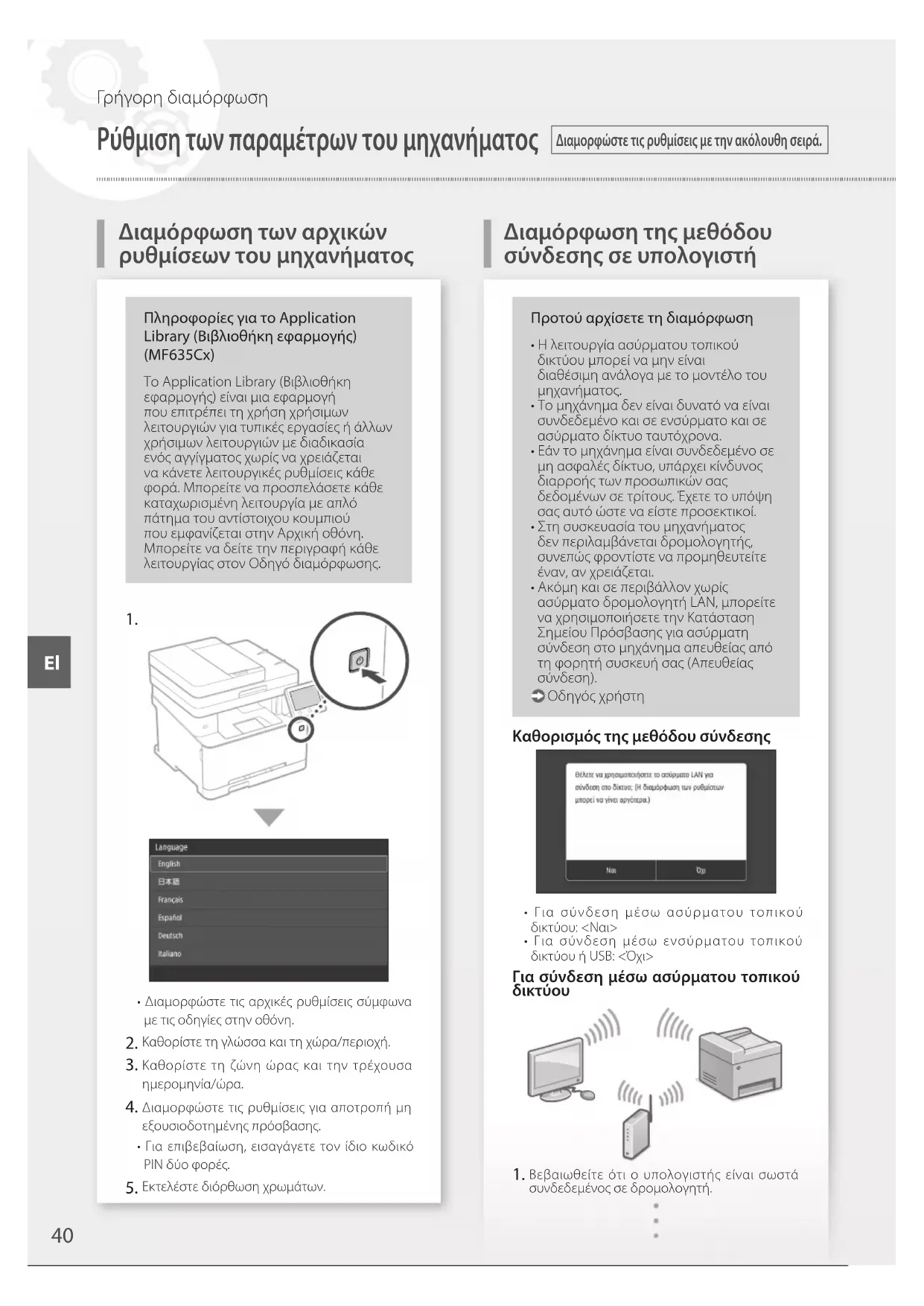 - Διαμορφώστε τις αρχικές ρυθμίσεις σύμφωνα με τις οδηγίες στην οθόνη. Καθορίστε τη γλώσσα και τη χώρα/περιοχή. Καθορίστε τη ζώνη ώρας και την τρέχουσα ημερομηνία/ώρα. Διαμορφώστε τις ρυθμίσεις για αποτροπή μη εξουσιοδοτημένης πρόσβασης.• Για επιβεβαίωση, εισαγάγετε τον ίδιο κωδικό ΡΙΝ δύο φορές. Εκτελέστε διόρθωση χρωμάτων.Προτού αρχίσετε τη διαμόρφωση• Η λειτουργία ασύρματου τοπικού δικτύου μπορεί να μην είναι διαθέσιμη ανάλογα με το μοντέλο του μηχανήματος.• Το μηχάνημα δεν είναι δυνατό να είναι συνδεδεμένο και σε ενσύρματο και σε ασύρματο δίκτυο ταυτόχρονα.• Εάν το μηχάνημα είναι συνδεδεμένο σε μη ασφαλές δίκτυο, υπάρχει κίνδυνος διαρροής των προσωπικών σας δεδομένων σε τρίτους. Έχετε το υπόψη σας αυτό ώστε να είστε προσεκτικοί.• Στη συσκευασία του μηχανήματος δεν περιλαμβάνεται δρομολογητής, συνεπώς φροντίστε να προμηθευτείτε έναν, αν χρειάζεται.• Ακόμη και σε περιβάλλον χωρίς ασύρματο δρομολογητή LAN, μπορείτε να χρησιμοποιήσετε την Κατάσταση Σημείου Πρόσβασης για ασύρματη σύνδεση στο μηχάνημα απευθείας από τη φορητή συσκευή σας (Απευθείας σύνδεση). Οδηγός χρήστη Καθορισμός της μεθόδου σύνδεσης