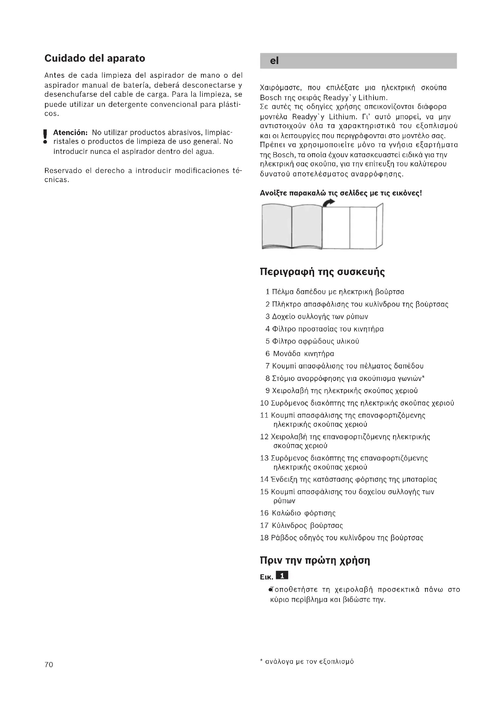 Χαιρόμαστε, που επιλέξατε μια ηλεκτρική σκούπα Bosch της σειράς Readyy`y Lithium. Σε αυτές τις οδηγίες χρήσης απεικονίζονται διάφορα μοντέλα Readyy`y Lithium. Γι’ αυτό μπορεί, να μην αντιστοιχούν όλα τα χαρακτηριστικά του εξοπλισμού και οι λειτουργίες που περιγράφονται στο μοντέλο σας. Πρέπει να χρησιμοποιείτε μόνο τα γνήσια εξαρτήματα της Bosch, τα οποία έχουν κατασκευαστεί ειδικά για την ηλεκτρική σας σκούπα, για την επίτευξη του καλύτερου δυνατού αποτελέσματος αναρρόφησης. Ανοίξτε παρακαλώ τις σελίδες με τις εικόνες! Περιγραφή της συσκευής 1 Πέλμα δαπέδου με ηλεκτρική βούρτσα 2 Πλήκτρο απασφάλισης του κυλίνδρου της βούρτσας 3 Δοχείο συλλογής των ρύπων 4 Φίλτρο προστασίας του κινητήρα 5 Φίλτρο αφρώδους υλικού 6 Μονάδα κινητήρα 7 Κουμπί απασφάλισης του πέλματος δαπέδου 8 Στόμιο αναρρόφησης για σκούπισμα γωνιών* 9 Χειρολαβή της ηλεκτρικής σκούπας χεριού 10 Συρόμενος διακόπτης της ηλεκτρικής σκούπας χεριού 11 Κουμπί απασφάλισης της επαναφορτιζόμενης ηλεκτρικής σκούπας χεριού 12 Χειρολαβή της επαναφορτιζόμενης ηλεκτρικής σκούπας χεριού 13 Συρόμενος διακόπτης της επαναφορτιζόμενης ηλεκτρικής σκούπας χεριού 14 Ένδειξη της κατάστασης φόρτισης της μπαταρίας 15 Κουμπί απασφάλισης του δοχείου συλλογής των