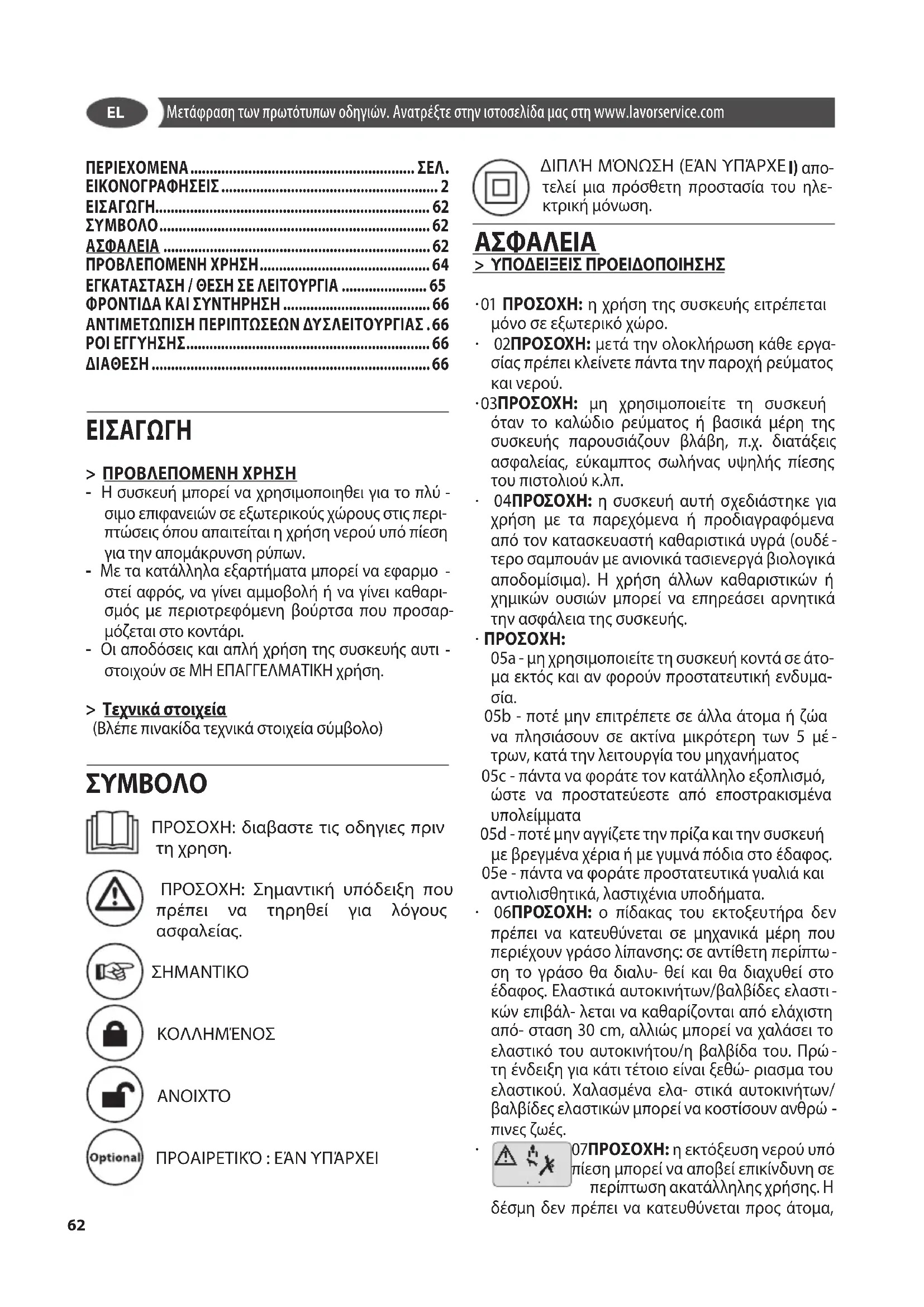 σιμο επιφανειών σε εξωτερικούς χώρους στις περι- πτώσεις όπου απαιτείται η χρήση νερού υπό πίεση για την απομάκρυνση ρύπων. - Με τα κατάλληλα εξαρτήματα μπορεί να εφαρμο