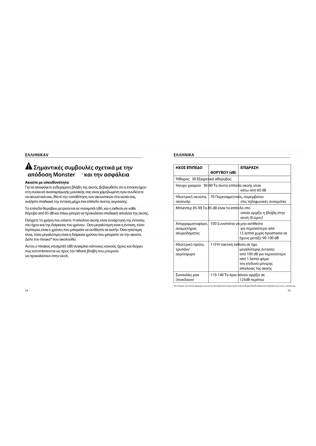 | Μηλέντερ 85-90 Ta | 85 dB εἶναι ο εἰπίπεδο στο έποία apχίζει η βλάβη στην ακόη (8 ύες) | |