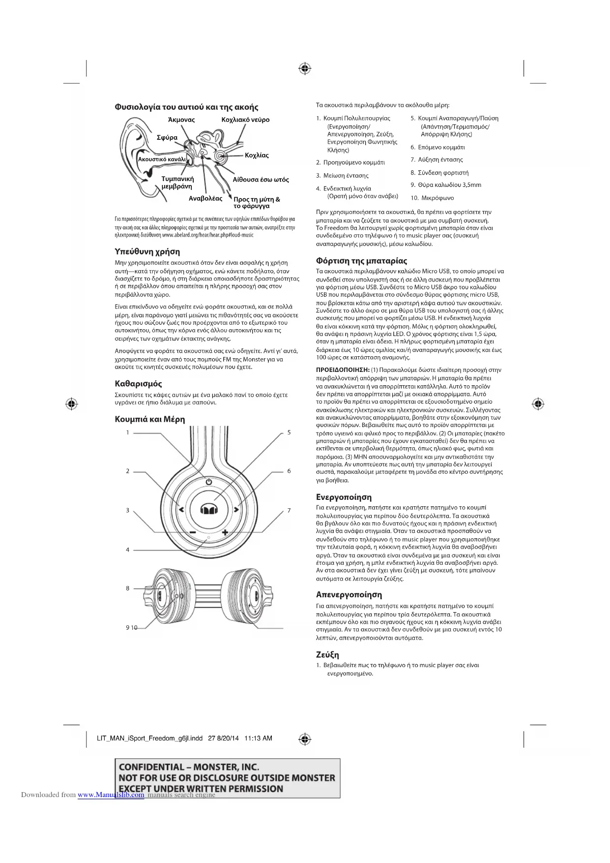 ∕₈" (3.5mm) στερεοφωνικό βύσμα στη συσκευή αναπαραγωγής μουσικής σας. Απαντήστε τις κλήσεις σας: Όταν ειδοποιηθείτε για μια εισερχόμενη κλήση, πατήστε και αφήστε το κουμπί ελέγχου του ControlTalk Universal™ για να απαντήσετε. Τερματίστε μια κλήση: Στα περισσότερα τηλέφωνα, πατήστε και αφήστε το κουμπί ελέγχου. Ορισμένα τηλέφωνα απαιτούν από εσάς να πιέσετε και να κρατήσετε πατημένο το κουμπί ελέγχου. Χρησιμοποιώντας την αναμονή κλήσεων: Τα περισσότερα τηλέφωνα (αλλά όχι όλα) λειτουργούν ως εξής: Όταν ειδοποιηθείτε για μια εισερχόμενη κλήση ενώ μιλάτε, πατήστε και αφήστε το κουμπί ελέγχου για να απαντήσετε και να θέσετε την πρώτη κλήση σε αναμονή. Πατήστε και αφήστε το κουμπί ελέγχου για να επανέλθετε πίσω στην πρώτη κλήση. Πατήστε και κρατήστε πατημένο το κουμπί ελέγχου για να τερματίσετε την τρέχουσα κλήση και να γυρίστε στην κλήση σε αναμονή. Αναπαραγωγή ή παύση ενός τραγουδιού ή βίντεο: Πατήστε και αφήστε το κουμπί κέντρο. Επαναλάβετε για να συνεχίσετε. Η λειτουργικότητα διαφέρει ανάλογα με τη συσκευή. Για περισσότερες πληροφορίες σχετικά με τη λειτουργικότητα της συσκευής σας, μπορείτε να επισκεφθείτε MonsterProducts.com/mp3/ ctuniversalworks.asp LIT_MAN_iSport_Freedom_g6jl.indd 28 8/20/14 11:13 AM Downloaded from www.Manualslib.com manuals search engine«Στρώσιμο» ακουστικών Ώρα για στρώσιμο των ακουστικών; Νομίζετε ότι αστειευόμαστε; Όχι, δεν αστειευόμαστε. Όπως όλα τα προϊόντα υψηλών επιδόσεων, είτε πρόκειται για αυτοκίνητο είτε για ακουστικά, πρόκειται για μηχανικές συσκευές που φθάνουν στο βέλτιστο επίπεδο λειτουργίας μετά από χρήση ορισμένου χρονικού διαστήματος. Τα νέα σας ακουστικά θα ακούγονται τέλεια μόλις τα βγάλετε από τη συσκευασία τους, αλλά θα «μαλακώσουν» μετά από χρήση ορισμένου χρονικού διαστήματος και θα ακούγονται ακόμη καλύτερα. Συνιστούμε να τα χρησιμοποιήσετε για 8 ώρες. Μετά από 20 ώρες χρήσης, θα πρέπει να έχουν «στρώσει» πλήρως. Απολαύστε τα. ΠΕΡΙΟΡΙΣΜΕΝΗ ΕΓΓΥΗΣΗ ΚΑΤΑΝΑΛΩΤΩΝ Η εταιρεία Monster, LLC, 7251 West Lake Mead Blvd., Las Vegas, NV 89128, USA, [ΠΑΡΑΚΑΛΟΥΜΕ ΣΗΜΕΙΩΣΤΕ ΟΤΙ Η MONSTER ΔΕΝ ΔΕΧΕΤΑΙ ΤΗΝ ΑΠΟΣΤΟΛΗ ΠΡΟΪΟΝΤΩΝ ΣΕ ΑΥΤΗΝ ΤΗ ΔΙΕΥΘΥΝΣΗ – ΑΚΟΛΟΥΘΗΣΤΕ ΤΙΣ ΟΔΗΓΙΕΣ ΣΤΗΝ ΠΑΡΑΓΡΑΦΟ «ΤΡΟΠΟΣ ΥΠΟΒΟΛΗΣ ΑΠΑΙΤΗΣΗΣ» ΠΑΡΑΚΑΤΩ] (415) 840-2000 (εφεξής καλούμενη «Monster») σας παρέχει την παρούσα Περιορισμένη Εγγύηση. Το γραπτό ή εθιμικό δίκαιο ενδέχεται να σας παρέχει πρόσθετα δικαιώματα ή τρόπους αποκατάστασης που δεν επηρεάζονται από την παρούσα Περιορισμένη Εγγύηση.