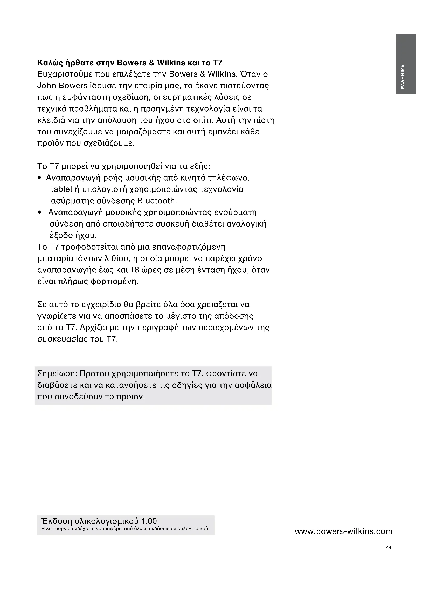 www.bowers-wilkins.com Καλώς ήρθατε στην Bowers & Wilkins και το T7 Ευχαριστούμε που επιλέξατε την Bowers & Wilkins. Όταν ο John Bowers ίδρυσε την εταιρία μας, το έκανε πιστεύοντας πως η ευφάνταστη σχεδίαση, οι ευρηματικές λύσεις σε τεχνικά προβλήματα και η προηγμένη τεχνολογία είναι τα κλειδιά για την απόλαυση του ήχου στο σπίτι. Αυτή την πίστη του συνεχίζουμε να μοιραζόμαστε και αυτή εμπνέει κάθε προϊόν που σχεδιάζουμε. Το Τ7 μπορεί να χρησιμοποιηθεί για τα εξής: