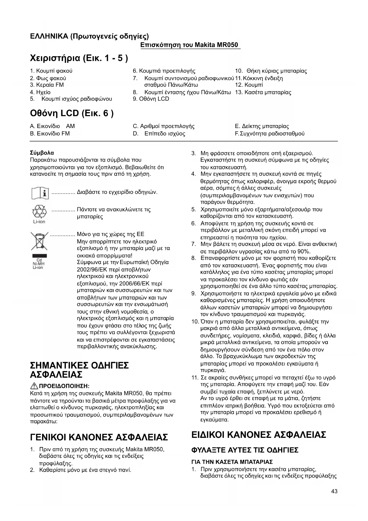 ΠΡΟΕΙΔΟΠΟΙΗΣΗ: Κατά τη χρήση της συσκευής Makita MR050, θα πρέπει πάντοτε να τηρούνται τα βασικά μέτρα προφύλαξης για να ελαττωθεί ο κίνδυνος πυρκαγιάς, ηλεκτροπληξίας και προσωπικού τραυματισμού, συμπεριλαμβανομένων των