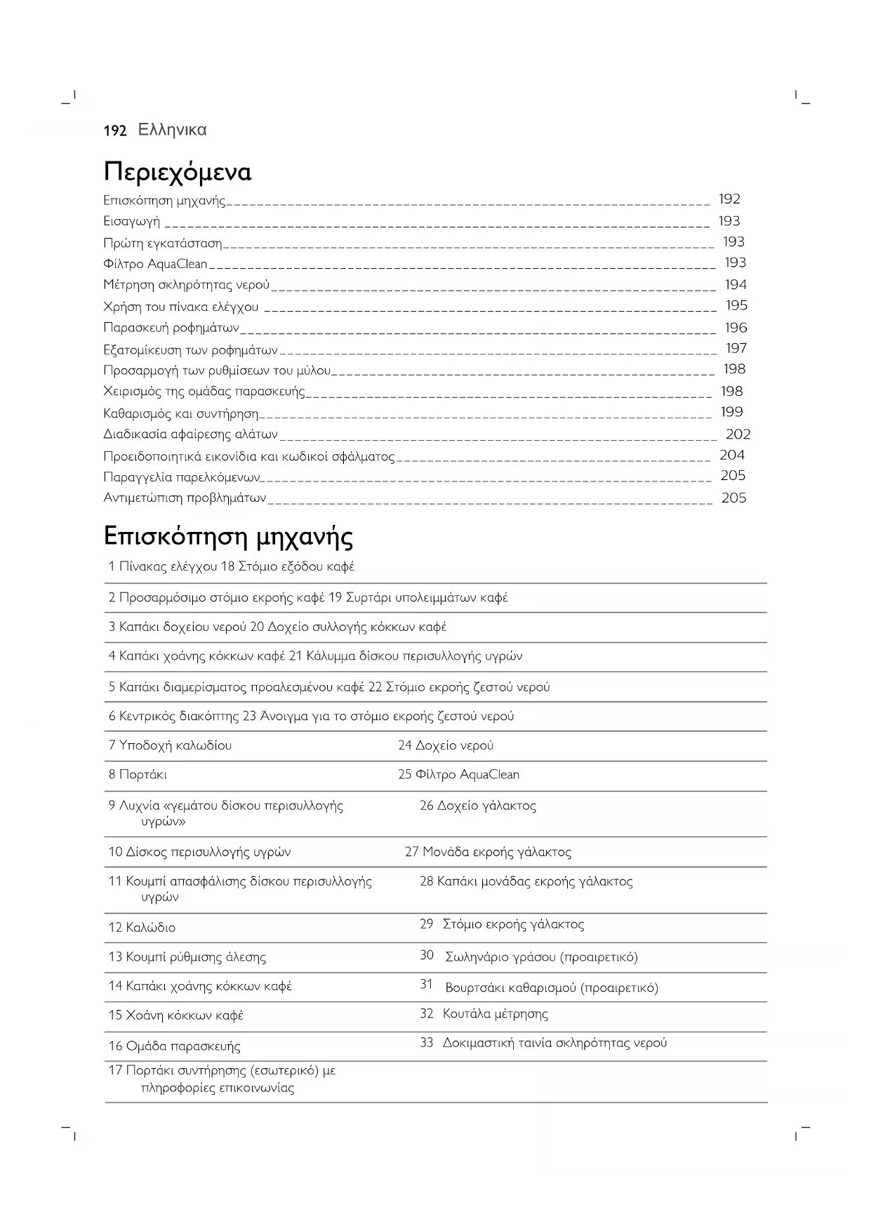 17 Πορτάκι συντήρησης (εσωτερικό) με πληροφορίες επικοινωνίας Σωληνάριο γράσου (προαιρετικό) Βουρτσάκι καθαρισμού (προαιρετικό)Εισαγωγή Συγχαρητήρια για την αγορά της πλήρως αυτόματης μηχανής καφέ της Philips! Για να επωφεληθείτε πλήρως από την υποστήριξη που παρέχει η Philips, δηλώστε το προϊόν σας στον ιστότοπο www.philips.com/coffee-care. Διαβάστε προσεκτικά το ξεχωριστό φυλλάδιο ασφαλείας πριν από την πρώτη χρήση της μηχανής και φυλάξτε το για μελλοντική αναφορά. Για να σας βοηθήσει να αξιοποιήσετε στο έπακρο τη μηχανή καφέ σας, η Philips προσφέρει πλήρη υποστήριξη με 3 διαφορετικούς τρόπους: 1 Τον ξεχωριστό οδηγό γρήγορης έναρξης για την πρώτη εγκατάσταση και την πρώτη χρήση. 2 Το παρόν εγχειρίδιο χρήσης για αναλυτικότερες πληροφορίες. 3 Ηλεκτρονική υποστήριξη και βίντεο: σαρώστε τον κωδικό QR στην μπροστινή σελίδα ή επισκεφτείτε τη διεύθυνση www.philips.com/coffee-care Σημείωση: Αυτή η μηχανή έχει ελεγχθεί με καφέ. Αν και έχει καθαριστεί προσεκτικά, ίσως να υπάρχουν ορισμένα υπολείμματα καφέ. Ωστόσο, εγγυόμαστε ότι η μηχανή είναι απολύτως καινούρια. Πρώτη εγκατάσταση Για να προετοιμάσετε τη μηχανή καφέ για χρήση, θα πρέπει να εκτελέσετε μερικά απλά βήματα, όπως την πλήρωση του κυκλώματος νερού και την ενεργοποίηση του φίλτρου AquaClean. Μπορείτε να βρείτε αυτά τα βήματα στον ξεχωριστό οδηγό γρήγορης έναρξης. Προκειμένου ο καφές σας να έχει την καλύτερη δυνατή γεύση, θα πρέπει πρώτα να παρασκευάσετε 5 καφέδες, ώστε η μηχανή να μπορέσει να ολοκληρώσει την αυτο-ρύθμισή της. Η μηχανή έχει ρυθμιστεί έτσι ώστε να επιτυγχάνεται το καλύτερο γευστικό αποτέλεσμα από του κόκκους καφέ σας. Επομένως, σας συμβουλεύουμε να μην προσαρμόσετε τις ρυθμίσεις του μύλου προτού παρασκευάσετε 100-150 φλιτζάνια (περίπου 1 μήνας χρήσης). Φίλτρο AquaClean Το φίλτρο AquaClean έχει σχεδιαστεί έτσι, ώστε να μειώνει τις εναποθέσεις αλάτων στη μηχανή καφέ και να παρέχει φιλτραρισμένο νερό, για να διατηρείται το άρωμα και η γεύση κάθε φλιτζανιού καφέ. Αν χρησιμοποιείτε μια σειρά 8 φίλτρων AquaClean, όπως υποδεικνύεται στη μηχανή και σε αυτό το εγχειρίδιο χρήστη, δεν θα χρειαστεί να καθαρίσετε τη μηχανή σας από τα άλατα για έως και 5000 φλιτζάνια. Με κάθε φίλτρο μπορείτε να απολαύσετε έως 625 φλιτζάνια, ανάλογα με τις επιλεγμένες ποικιλίες καφές, καθώς και τις συχνότητες ξεπλύματος και καθαρισμού. Προετοιμασία του φίλτρου AquaClean για ενεργοποίηση Πριν να τοποθετήσετε το φίλτρο AquaClean στο δοχείο νερού, θα πρέπει να το προετοιμάσετε για χρήση: 1 Ανακινήστε το φίλτρο για περίπου 5 δευτερόλεπτα (Εικ. 2). 2 Βυθίστε το φίλτρο ανάποδα σε μια κανάτα με κρύο νερό και περιμένετε μέχρι να σταματήσουν να βγαίνουν (Εικ.