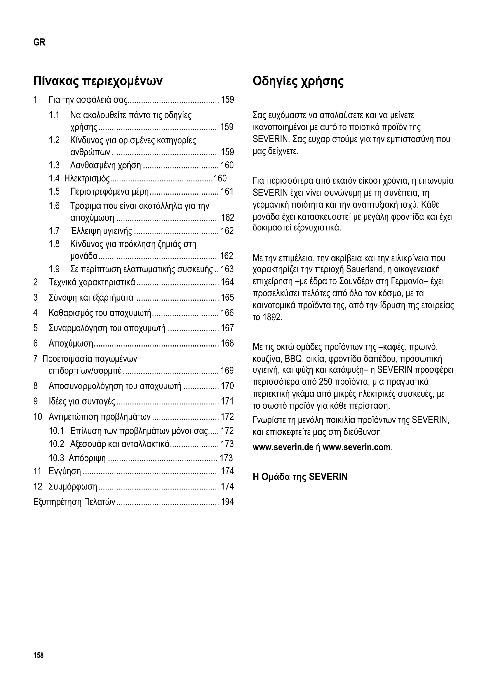 κουζίνα, BBQ, οικία, φροντίδα δαπέδου, προσωπική υγιεινή, και ψύξη και κατάψυξη– η SEVERIN προσφέρει περισσότερα από 250 προϊόντα, μια πραγματικά περιεκτική γκάμα από μικρές ηλεκτρικές συσκευές, με το σωστό προϊόν για κάθε περίσταση. Γνωρίστε τη μεγάλη ποικιλία προϊόντων της SEVERIN, και επισκεφτείτε μας στη διεύθυνση www.severin.de ή www.severin.com. Η Ομάδα της SEVERIN Πίνακας περιεχομένων 1 Για την ασφάλειά σας......................................... 159