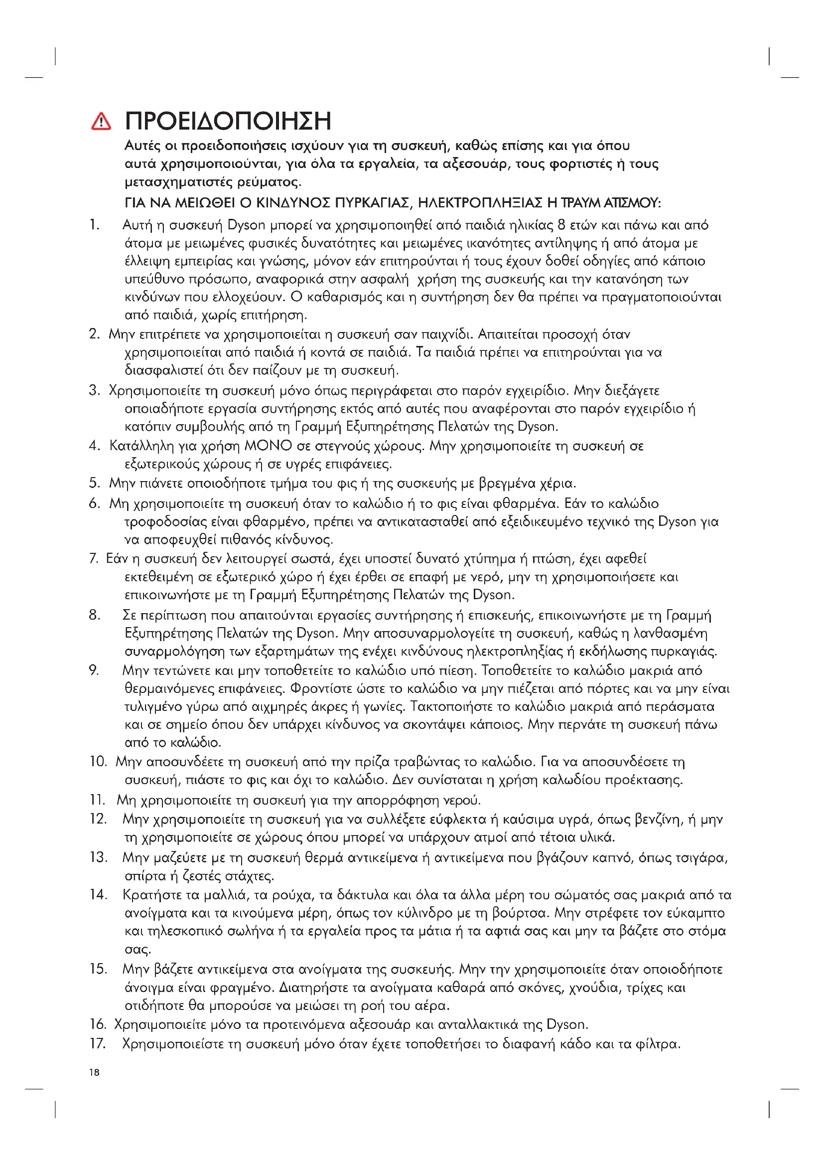 - Στις περιπτώσεις όπου η παρούσα συσκευή πωλείται εντός της ΕΕ, η παρούσα εγγύηση ισχύει μόνο (i) εάν η συσκευή χρησιμοποιείται στη χώρα στην οποία πωλήθηκε ή (ii) εάν η συσκευή χρησιμοποιείται στην Αυστρία, το Βέλγιο τη Γαλλία, Γερμανία, Ιρλανδία, Ιταλία, Ολλανδία, Ισπανία ή Ηνωμένο Βασίλειο και το ίδιο μοντέλο με αυτή τη συσκευή πωλείται στην ίδια ονομαστική τάση στη σχετική χώρα.. TI ΔΕΝ ΚΑΛΥΠΤΕΙ Η ΕΓΓΥΗΣΗ Η Dyson ή ο εξουσιοδοτημένος της αντιπρόσωπος, δεν εγγυάται την επισκευή ή αντικατάσταση της συσκευής που οφείλεται σε: