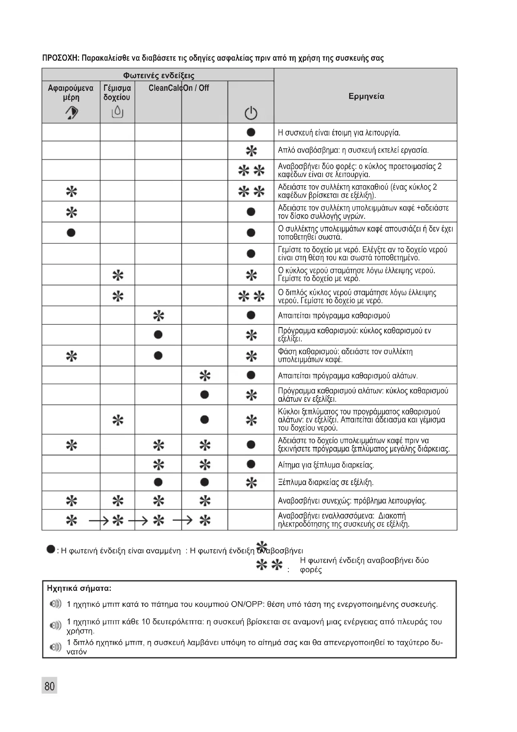 Φάση καθαρισμού: αδειάστε τον συλλέκτη υπολειμμάτων καφέ. Απαιτείται πρόγραμμα καθαρισμού αλάτων. Πρόγραμμα καθαρισμού αλάτων: κύκλος καθαρισμού αλάτων εν εξελίξει. Κύκλοι ξεπλύματος του προγράμματος καθαρισμού αλάτων: εν εξελίξει. Απαιτείται άδειασμα και γέμισμα του δοχείου νερού. Αδειάστε το δοχείο υπολειμμάτων καφέ πριν να ξεκινήσετε πρόγραμμα ξεπλύματος μεγάλης διάρκειας. Αίτημα για ξέπλυμα διαρκείας. Ξέπλυμα διαρκείας σε εξέλιξη. Αναβοσβήνει συνεχώς: πρόβλημα λειτουργίας. Αναβοσβήνει εναλλασσόμενα: Διακοπή ηλεκτροδότησης της συσκευής σε εξέλιξη. : Η φωτεινή ένδειξη είναι αναμμένη : Η φωτεινή ένδειξη αναβοσβήνει