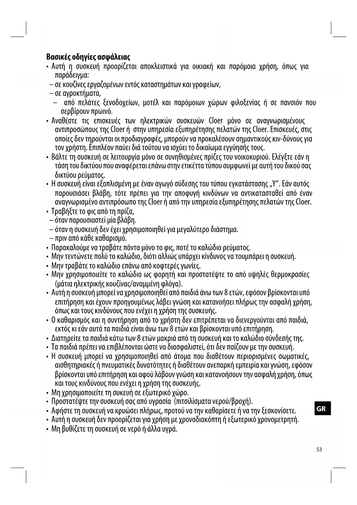 - Αναθέστε τις επισκευές των ηλεκτρικών συσκευών Cloer μόνο σε αναγνωρισμένους αντιπροσώπους της Cloer ή στην υπηρεσία εξυπηρέτησης πελατών της Cloer. Επισκευές, στις οποίες δεν τηρούνται οι προδιαγραφές, μπορούν να προκαλέσουν σημαντικούς κιν-δύνους για τον χρήστη. Επιπλέον παύει διά τούτου να ισχύει το δικαίωμα εγγύησής τους.