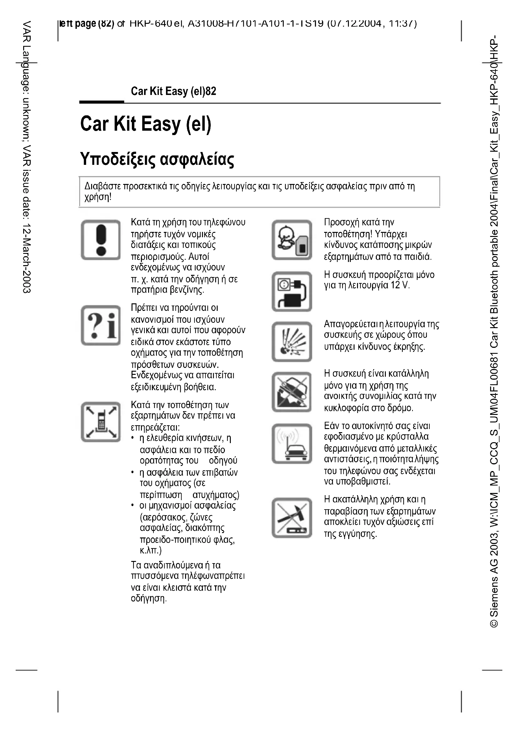 37) Car Kit Easy (el)82 VAR Language: unknown; VAR issue date: 12-March-2003 Car Kit Easy (el) Υποδείξεις ασφαλείας ∆ιαβάστε προσεκτικά τις οδηγίες λειτουργίας και τις υποδείξεις ασφαλείας πριν από τη