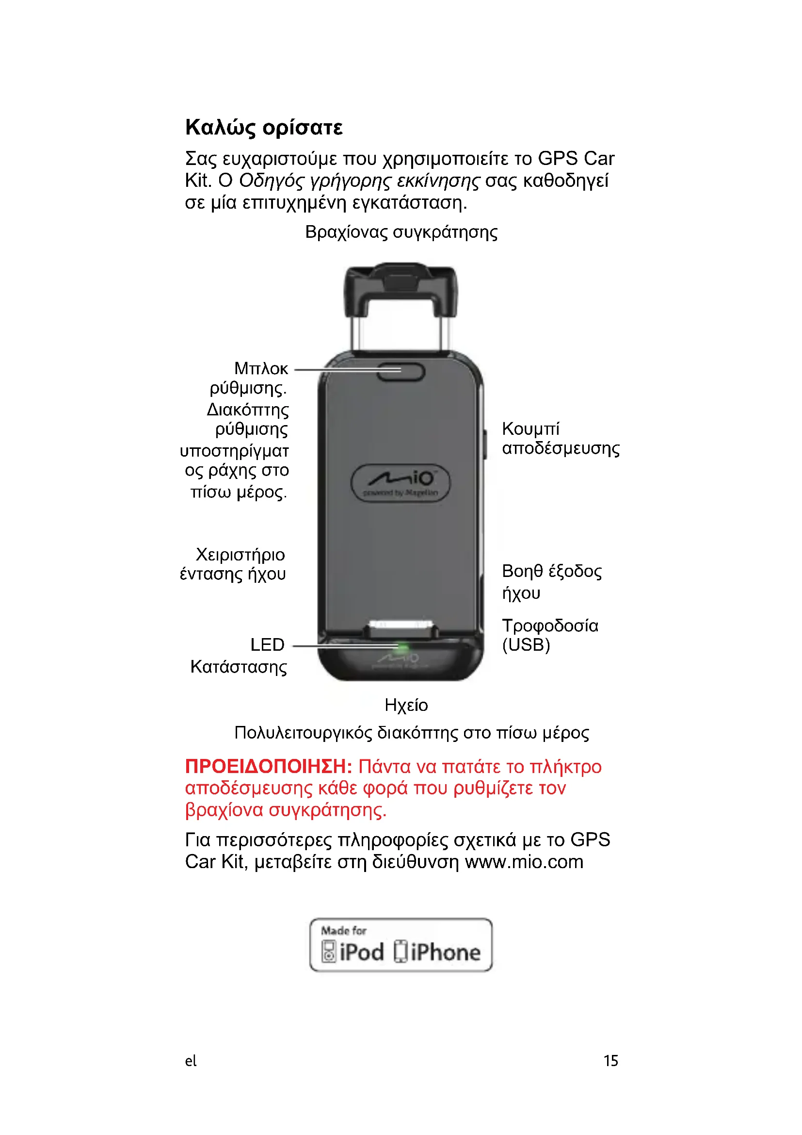 ΠΡΟΕΙΔΟΠΟΙΗΣΗ: Πάντα να πατάτε το πλήκτρο αποδέσμευσης κάθε φορά που ρυθμίζετε τον βραχίονα συγκράτησης. Για περισσότερες πληροφορίες σχετικά με το GPS Car Kit, μεταβείτε στη διεύθυνση www.mio.com