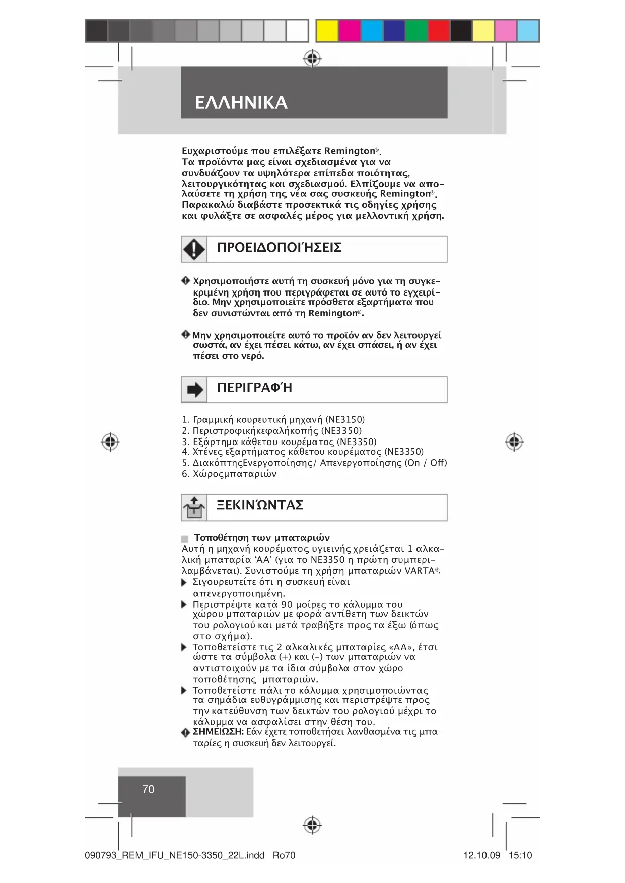 ΣΗΜΕΙΩΣΗ: Εάν έχετε τοποθετήσει λανθασμένα τις μπα- ταρίες η συσκευή δεν λειτουργεί. 090793_REM_IFU_NE150-3350_22L.indd Ro70090793_REM_IFU_NE150-3350_22L.indd Ro70 12.10.09 15:1012.10.09 15:1071 GBDNLFEIDKSFINPSKCZ HUN PLRUTRROGRSL HR/ SRB AEHE GR EΛΛΗΝІΚΑ ΣΗΜΕΙΩΣΗ: Αφαιρέστε τις μπαταρίες εάν δεν χρησιμοποιείτε τη συσκευή για μεγάλο χρονικό ΑΛΛΑΖΩΝΤΑΣ ΤΗΝ ΚΕΦΑΛΗ ΚΟΠΗΣ (NE3350) Βεβαιωθείτε ότι το προϊόν είναι απενεργοποιημένο. Αφαιρέστε την κεφαλή περιστρέφοντας την δεξιό- στροφα προς τη θέση ξεκλειδώματος και μετά τρα- βώντας την. Συναρμολογήστε την άλλη κεφαλή, τοποθετώντας την στο πάνω μέρος της συσκευής και περιστρέφο- ντάς την προς τα αριστερά για να ασφαλίσει. ΕΝΕΡΓΟΠΟΙΗΣΗ ΤΗΣ ΚΟΥΡΕΥΤΙΚΗΣ ΜΗΧΑΝΗΣ Ο διακόπτης On/Off είναι ενσωματωμένος στο καπά- κι της μπαταρίας. Περιστρέψτε το καπάκι της μπαταρίας δεξιόστροφα για ενεργοποίηση. Για απενεργοποίηση, απλώς περιστρέψτε το καπάκι της μπαταρίας αριστερόστροφα, πίσω στη θέση Off. ΟΔΗΓΊΕΣ ΧΡΉΣΗΣ ΓΙΑ ΝΑ ΑΦΑΙΡΕΣΕΤΕ ΤΡΙΧΕΣ ΑΠΟ ΤΗ ΜΥΤΗ Τοποθετείστε προσεκτικά τη συσκευή στο ρουθούνι Κινείστε προσεκτικά τη κεφαλή κοπής προς τα μέσα και προς τα έξω στο ρουθούνι σας, ενώ ταυτόχρονα περιστρέφετε τη συσκευή. Αποφύγετε να εισάγετε την κεφαλή κοπής παραπά- νω από 6 χιλιοστά μέσα στο ρουθούνι σας. ΓΙΑ ΤΗΝ ΠΕΡΙΠΟΙΗΣΗ ΤΩΝ ΦΡΥΔΙΩΝ Προσαρτήστε την κάθετη κουρευτική μηχανή.(NE3350) Για κούρεμα, προσαρτήστε μία από τις χτένες στην κάθετη γραμμική κουρευτική μηχανή.(NE3350) Κατευθύνετεπροσεκτικάτηνκεφαλήακριβείαςκατά μή- Για πλήρη αφαίρεση των τριχών, αφαιρέστε τη χτένα και χρησιμοποιήστε την κουρευτική μηχανή απευθεί- ας στο δέρμα και μετακινήστε την πάνω στην επιθυ- μητή περιοχή. Χρησιμοποιείστεαργέςκαιπροσεκτικέςκινήσεις. ΓΙΑ ΝΑ ΑΦΑΙΡΕΣΕΤΕ ΤΡΙΧΕΣ ΑΠΟ ΤΑ ΑΥΤΙΑ ΣΑΣ Τοποθετείστε προσεκτικά την κεφαλή ακριβείας στην περιοχή του έξω ακουστικού πόρου. Κινείστε προσεκτικά τη συσκευή με περιστροφικές κινήσεις στο αυτί σας. Αποφύγετε να εισάγετε την κεφαλή κοπής παραπά- νω από 6 χιλιοστά μέσα στον ακουστικό πόρο. ΣΗΜΕΙΩΣΗ: Μην πιέζετε με μεγάλη δύναμη γιατί μπορεί να χαλάσετε την κεφαλή κοπής και να τραυματίσετε το 090793_REM_IFU_NE150-3350_22L.indd Ro71090793_REM_IFU_NE150-3350_22L.indd Ro71 12.10.09 15:1012.10.09 15:1072 EΛΛΗΝІΚΑ ΦΡΟΝΤΙΣΤΕ ΤΗΝ ΚΟΥΡΕΥΤΙΚΗ ΜΗΧΑΝΗ ΣΑΣ Φροντίστε την συσκευή σας για να εξασφαλίσετε μακρόχρονες επιδόσεις. Προτείνουμε να καθαρίζετε τη συσκευή σας μετά από κάθε χρήση. Ο ευκολότερος και υγιεινότερος τρόπος καθαρισμού της συσκευής είναι να ξεπλένετε την κεφαλή κοπής κάτω από ζεστό τρεχούμενο νερό. Έχετε πάντα τον διακόπτη στην θέση «off» όταν δεν χρησιμοποιείτε την κουρευτική μηχανή. ΜΕΤΑ ΑΠΟ ΚΑΘΕ ΧΡΗΣΗ Ξεπλύνετε τις τρίχες που έχουν μαζευτεί στην κεφα- λή κοπής και στη συνέχεια τινάξτε το νερό που έχει παραμείνει στη συσκευή. Σκουπίστε προσεκτικά το κυρίως μέρος της συσκευής με ένα υγρό ύφασμα και στεγνώστε αμέσως. Το προϊόν είναι κατάλληλο για χρήση στην μπα- νιέρα και για καθαρισμό με νερό. ΠΡΟΕΙΔΟΠΟΙΗΣΕΙΣ ΓΙΑ ΤΟΝ ΚΑΘΑΡΙΣΜΟ Ο καθαρισμός πρέπει να γίνεται μόνο με μαλακό Μην χρησιμοποιείτε σκληρά ή διαβρωτικά καθαριστικά στη κεφαλή και τις λεπίδες. Μην πιέζετε τις λεπίδες με δύναμη ή πάνω σε σκλη- ρά αντικείμενα. Μην βυθίζετε τη συσκευή στο νερό γιατί θα προκληθεί βλάβη. ΣΗΜΑΝΤΙΚΕΣ ΟΔΗΓΙΕΣ ΑΣΦΑΛΕΙΑΣ Αποθηκεύετε πάντα τη συσκευή σε μέρος χωρίς υγρασία. Μην αποθηκεύετε σε χώρους με θερμοκρασία που ξεπερνά τους 60˚C. Χρησιμοποιήστε και αποθηκεύστε τη συσκευή σε θερμοκρασίες ανάμεσα στους 15˚C και 35˚C. Μην 