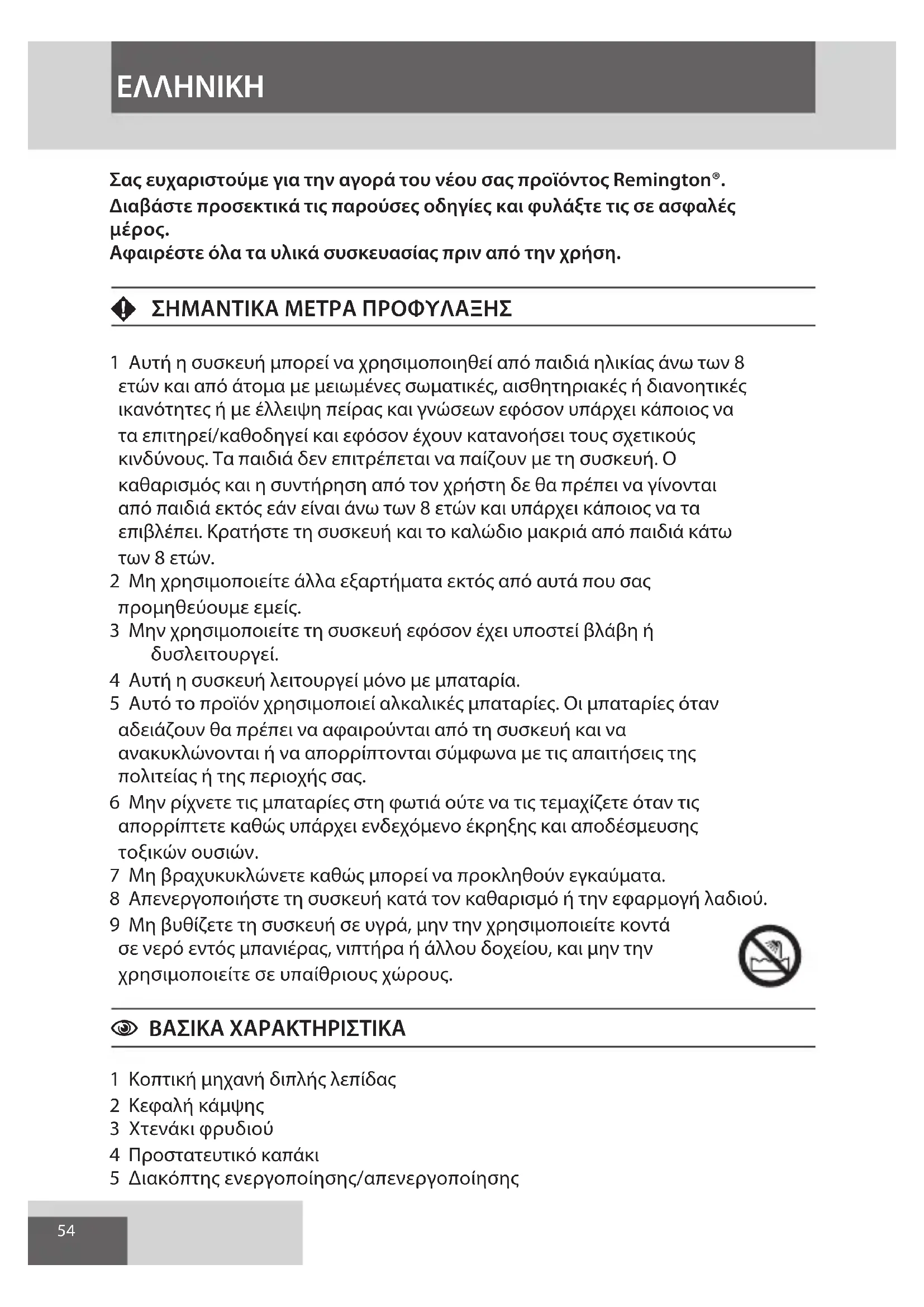 Αφαιρέστε όλα τα υλικά συσκευασίας πριν από την χρήση. F ΣΗΜΑΝΤΙΚΑ ΜΕΤΡΑ ΠΡΟΦΥΛΑΞΗΣ 1 Αυτή η συσκευή μπορεί να χρησιμοποιηθεί από παιδιά ηλικίας άνω των 8 ετών και από άτομα με μειωμένες σωματικές, αισθητηριακές ή διανοητικές ικανότητες ή με έλλειψη πείρας και γνώσεων εφόσον υπάρχει κάποιος να τα επιτηρεί/καθοδηγεί και εφόσον έχουν κατανοήσει τους σχετικούς κινδύνους. Τα παιδιά δεν επιτρέπεται να παίζουν με τη συσκευή. Ο καθαρισμός και η συντήρηση από τον χρήστη δε θα πρέπει να γίνονται από παιδιά εκτός εάν είναι άνω των 8 ετών και υπάρχει κάποιος να τα επιβλέπει. Κρατήστε τη συσκευή και το καλώδιο μακριά από παιδιά κάτω των 8 ετών. 2 Μη χρησιμοποιείτε άλλα εξαρτήματα εκτός από αυτά που σας προμηθεύουμε εμείς. 3 Μην χρησιμοποιείτε τη συσκευή εφόσον έχει υποστεί βλάβη ή δυσλειτουργεί. 4 Αυτή η συσκευή λειτουργεί μόνο με μπαταρία. 5 Αυτό το προϊόν χρησιμοποιεί αλκαλικές μπαταρίες. Οι μπαταρίες όταν αδειάζουν θα πρέπει να αφαιρούνται από τη συσκευή και να ανακυκλώνονται ή να απορρίπτονται σύμφωνα με τις απαιτήσεις της πολιτείας ή της περιοχής σας. 6 Μην ρίχνετε τις μπαταρίες στη φωτιά ούτε να τις τεμαχίζετε όταν τις απορρίπτετε καθώς υπάρχει ενδεχόμενο έκρηξης και αποδέσμευσης τοξικών ουσιών. 7 Μη βραχυκυκλώνετε καθώς μπορεί να προκληθούν εγκαύματα. 8 Απενεργοποιήστε τη συσκευή κατά τον καθαρισμό ή την εφαρμογή λαδιού. 9 Μη βυθίζετε τη συσκευή σε υγρά, μην την χρησιμοποιείτε κοντά σε νερό εντός μπανιέρας, νιπτήρα ή άλλου δοχείου, και μην την χρησιμοποιείτε σε υπαίθριους χώρους. C ΒΑΣΙΚΑ ΧΑΡΑΚΤΗΡΙΣΤΙΚΑ 1 Κοπτική μηχανή διπλής λεπίδας 2 Κεφαλή κάμψης 3 Χτενάκι φρυδιού 4 Προστατευτικό καπάκι 5 Διακόπτης ενεργοποίησης/απενεργοποίησης EΛΛHNIKH55 6 Θήκη μπαταριών 7 Λυχνία λεπτομερειών C ΠΡΟΕΤΟΙΜΑΣΙΑ , ΤΟΠΟΘΕΤΗΣΗ ΜΠΑΤΑΡΙΑΣ