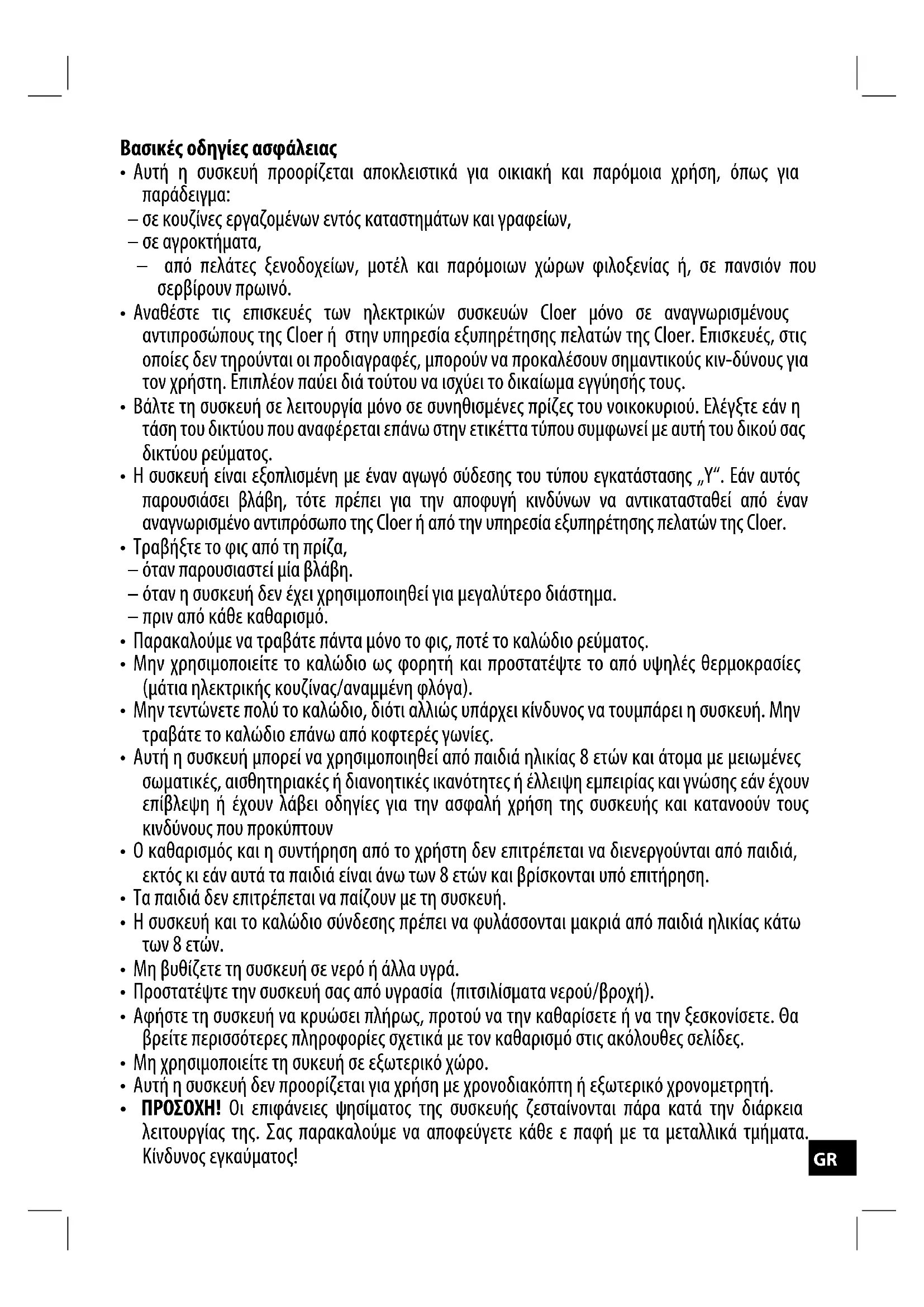 - Αναθέστε τις επισκευές των ηλεκτρικών συσκευών Cloer μόνο σε αναγνωρισμένους αντιπροσώπους της Cloer ή στην υπηρεσία εξυπηρέτησης πελατών της Cloer. Επισκευές, στις οποίες δεν τηρούνται οι προδιαγραφές, μπορούν να προκαλέσουν σημαντικούς κιν-δύνους για τον χρήστη. Επιπλέον παύει διά τούτου να ισχύει το δικαίωμα εγγύησής τους.