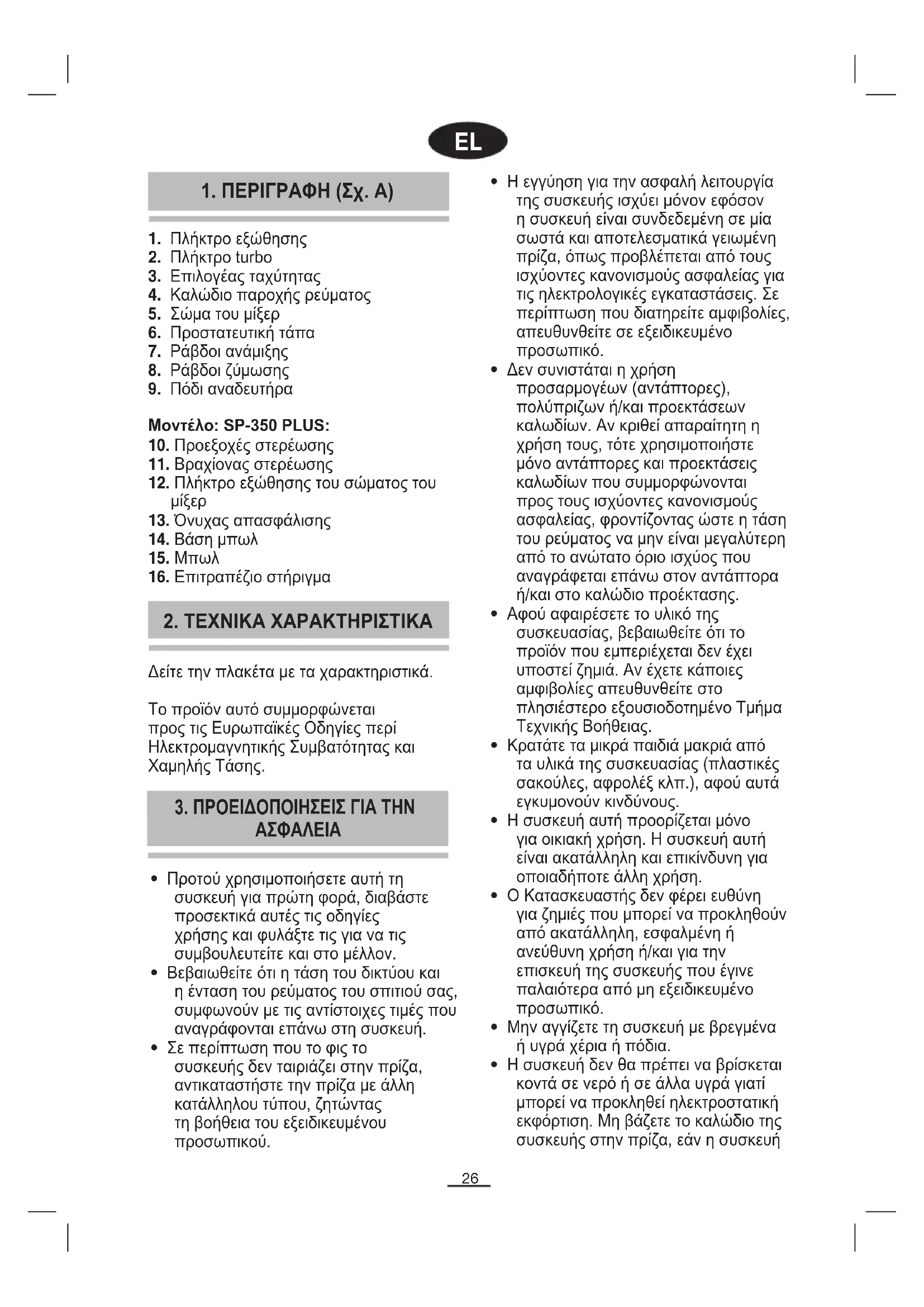 Δείτε την πλακέτα με τα χαρακτηριστικά. Το προϊόν αυτό συμμορφώνεται προς τις Ευρωπαϊκές Οδηγίες περί Ηλεκτρομαγνητικής Συμβατότητας και Χαμηλής Τάσης.27 ακουμπά επάνω σε υγρή επιφάνεια (όπου υπάρχει νερό).