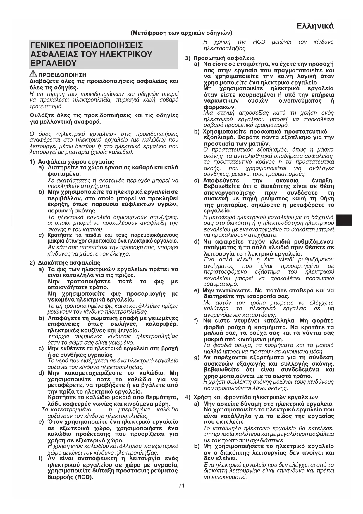 ΠΡΟΕΙΔΟΠΟΙΗΣΗ Διαβάζετε όλες τις προειδοποιήσεις ασφαλείας και όλες τις οδηγίες. Η μη τήρηση των προειδοποιήσεων και οδηγιών μπορεί να προκαλέσει ηλεκτροπληξία, πυρκαγιά και/ή σοβαρό τραυματισμό. Φυλάξτε όλες τις προειδοποιήσεις και τις οδηγίες για μελλοντική αναφορά. Ο όρος «ηλεκτρικό εργαλείο» στις προειδοποιήσεις αναφέρεται στο ηλεκτρικό εργαλείο (με καλώδιο) που λειτουργεί μέσω δικτύου ή στο ηλεκτρικό εργαλείο που λειτουργεί με μπαταρία (χωρίς καλώδιο).