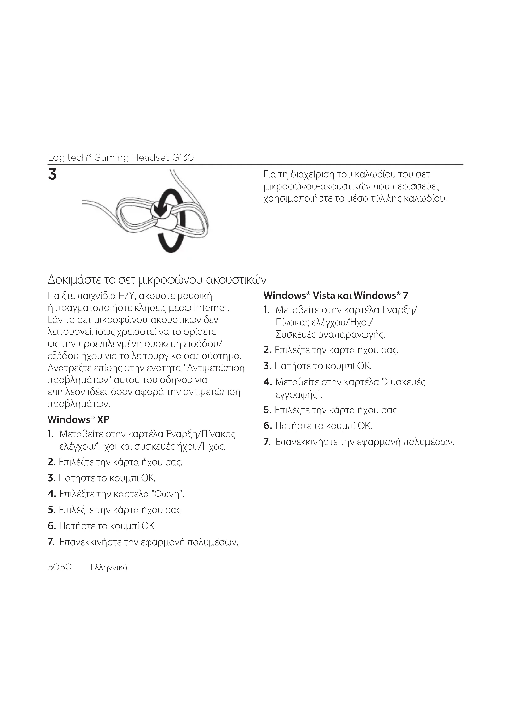 Για τη διαχείριση του καλωδίου του σετ μικροφώνου-ακουστικών που περισσεύει, χρησιμοποιήστε το μέσο τύλιξης καλωδίου. Δοκιμάστε το σετ μικροφώνου-ακουστικών Παίξτε παιχνίδια Η/Υ, ακούστε μουσική ή πραγματοποιήστε κλήσεις μέσω Internet. Εάν το σετ μικροφώνου-ακουστικών δεν λειτουργεί, ίσως χρειαστεί να το ορίσετε ως την προεπιλεγμένη συσκευή εισόδου/ εξόδου ήχου για το λειτουργικό σας σύστημα. Ανατρέξτε επίσης στην ενότητα "Αντιμετώπιση προβλημάτων" αυτού του οδηγού για επιπλέον ιδέες όσον αφορά την αντιμετώπιση προβλημάτων. Windows® XP