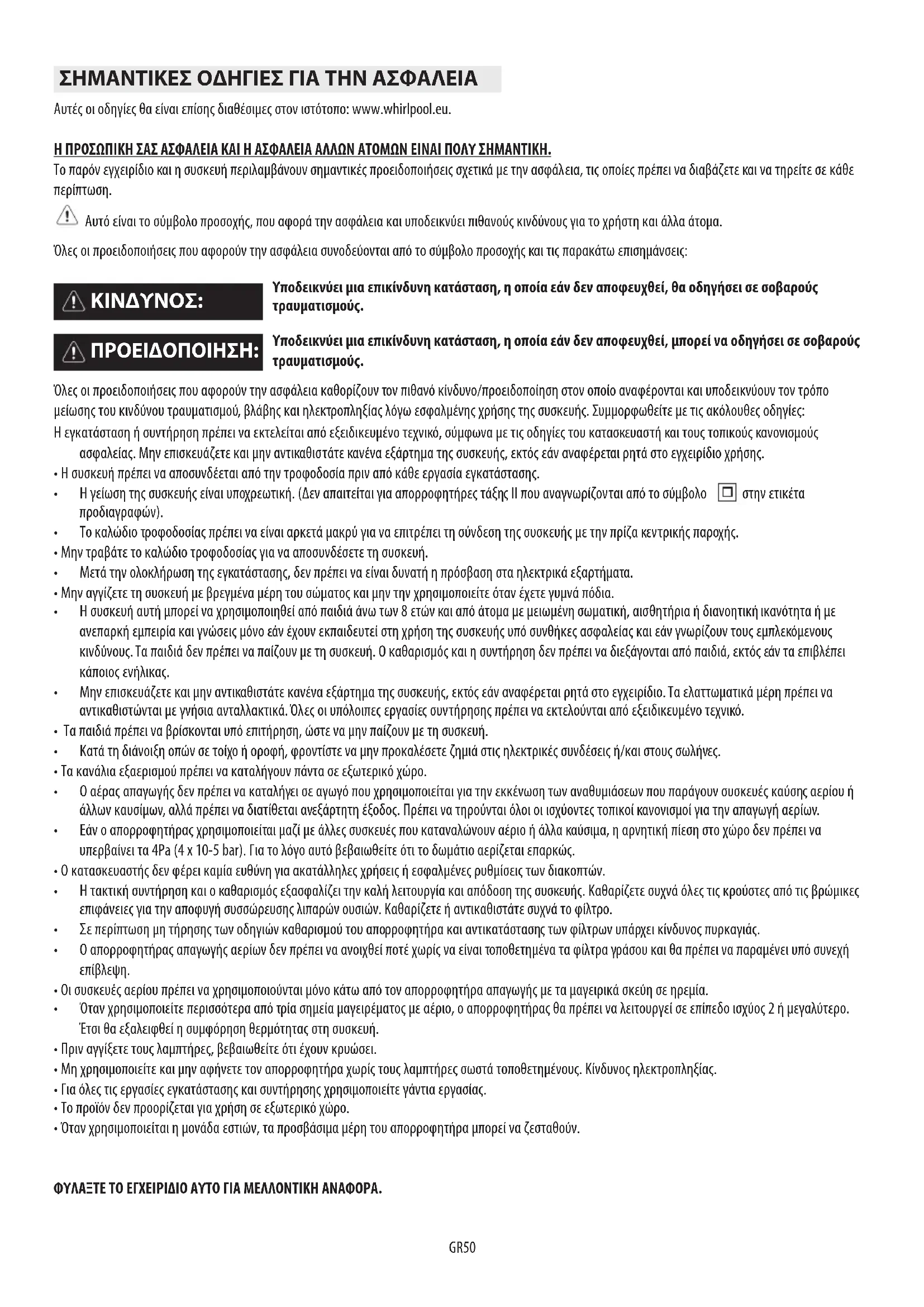- Όταν χρησιμοποιείται η μονάδα εστιών, τα προσβάσιμα μέρη του απορροφητήρα μπορεί να ζεσταθούν. ΦΥΛΑΞΤΕ ΤΟ ΕΓΧΕΙΡΙΔΙΟ ΑΥΤΟ ΓΙΑ ΜΕΛΛΟΝΤΙΚΗ ΑΝΑΦΟΡΑ. ΠΡΟΕΙΔΟΠΟΙΗΣΗ: ΚΙΝΔΥΝΟΣ:GR51 Μετά την αποσυσκευασία, ελέγξτε τη συσκευή για τυχόν ζημιές κατά τη μεταφορά. Εάν υπάρχει κάποιο πρόβλημα, επικοινωνήστε με τον αντιπρόσωπο ή με το πλησιέστερο κέντρο εξυπηρέτησης πελατών. Για να αποφευχθούν τυχόν ζημιές, αφαιρείτε τη συσκευή από τη συσκευασία φελιζόλ μόνο κατά τη στιγμή της εγκατάστασης. ΠΡΟΕΤΟΙΜΑΣΙΑ ΓΙΑ ΕΓΚΑΤΑΣΤΑΣΗ το προϊόν αυτό έχει μεγάλο βάρος. Η ανύψωση και η εγκατάσταση του απορροφητήρα πρέπει να πραγματοποιείται από δύο ή περισσότερα άτομα. Η ελάχιστη απόσταση μεταξύ του στηρίγματος των μαγειρικών σκευών πάνω στην κουζίνα και του κάτω μέρους του απορροφητήρα δεν πρέπει να είναι μικρότερη από 50 cm για ηλεκτρικές κουζίνες και 65 cm για κουζίνες αερίου ή μεικτές. Πριν από την εγκατάσταση, ελέγξτε επίσης τις ελάχιστες αποστάσεις που αναφέρονται στο εγχειρίδιο της κουζίνας. Εάν στις οδηγίες εγκατάστασης της κουζίνας συνιστάται μεγαλύτερη απόσταση μεταξύ της κουζίνας και του απορροφητήρα, ακολουθήστε τις σχετικές οδηγίες. ΗΛΕΚΤΡΙΚΗ ΣΥΝΔΕΣ Βεβαιωθείτε ότι η τάση που αναγράφεται στην πινακίδα ονομαστικών χαρακτηριστικών της συσκευής αντιστοιχεί στην τάση του δικτύου. Οι πληροφορίες αυτές μπορεί να αναγράφονται στο εσωτερικό του απορροφητήρα, κάτω από το φίλτρο για λίπη. Η αντικατάσταση του καλωδίου τροφοδοσίας (τύπου H05 VV-F 3 x 0,75 mm²) πρέπει να πραγματοποιείται από εξειδικευμένο ηλεκτρολόγο. Επικοινωνήστε με ένα εξουσιοδοτημένο κέντρο σέρβις. Εάν ο απορροφητήρας διαθέτει φις, συνδέστε το σε μια πρίζα που πληροί τους ισχύοντες κανονισμούς και βρίσκεται σε σημείο με εύκολη πρόσβαση μετά την εγκατάσταση. Εάν δεν υπάρχει φις (απευθείας σύνδεση στο δίκτυο) ή εάν η πρίζα δεν βρίσκεται σε σημείο με εύκολη πρόσβαση, πρέπει να εγκατασταθεί ένας τυπικός διπολικός διακόπτης που παρέχει τη δυνατότητα πλήρους απομόνωσης από το δίκτυο στις συνθήκες της κατηγορίας υπέρτασης ΙΙΙ σύμφωνα με τους κανονισμούς εγκατάστασης. ΓΕΝΙΚΕΣ ΣΥΣΤΑΣΕΙΣ Πριν τη χρήση Αφαιρέστε τα προστατευτικά από χαρτόνι, την προστατευτική μεμβράνη και τις αυτοκόλλητες ετικέτες από τα εξαρτήματα. Ελέγξτε τη συσκευή για τυχόν ζημιές κατά τη μεταφορά. Κατά τη διάρκεια της χρήσης Για να αποφευχθούν τυχόν ζημιές, μην τοποθετείτε βάρος πάνω στη συσκευή. Μην εκθέτετε τη συσκευή σε ατμοσφαιρικούς παράγοντες. ΠΡΟΕΙΔΟΠΟΙΗΣΗ: Απόρριψη συσκευασίαςΤο υλικό συσκευασίας είναι 100% ανακυκλώσιμο, όπως δείχνει το σύμβολο ανακύκλωσης . Συνεπώς, τα διάφορα μέρη της συσκευασίας πρέπει να απορρίπτονται κατάλληλα και σύμφωνα με τους τοπικούς κανονισμούς για την απόρριψη αποβλήτων. Απόρριψη του προϊόντος