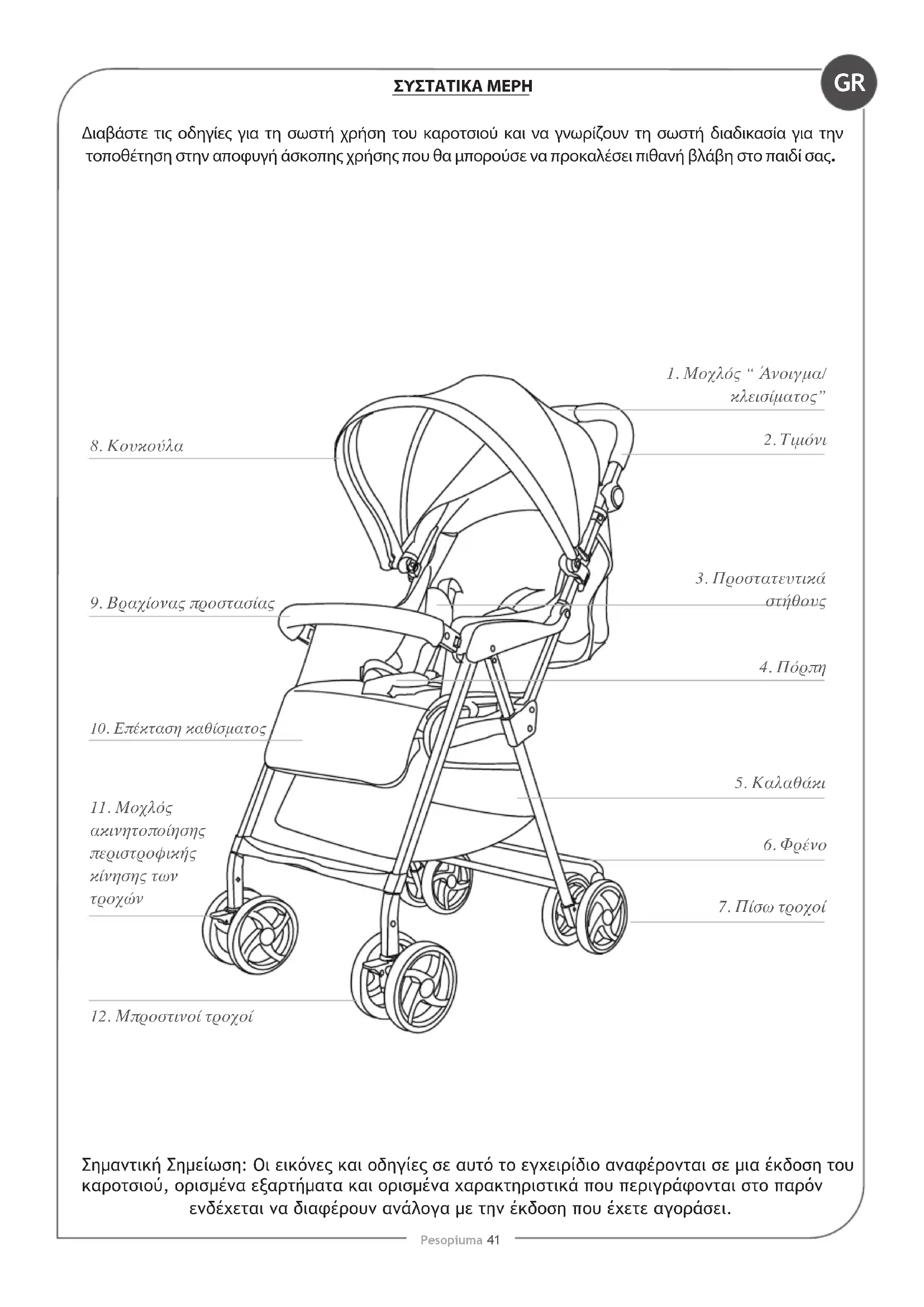 Pesopiuma 41 Διαβάστε τις οδηγίες για τη σωστή χρήση του καροτσιού και να γνωρίζουν τη σωστή διαδικασία για την τοποθέτηση στην αποφυγή άσκοπης χρήσης που θα μπορούσε να προκαλέσει πιθανή βλάβη στο παιδί σας. ΣΥΣΤΑΤΙΚΑ ΜΕΡΗ Σημαντική Σημείωση: Οι εικόνες και οδηγίες σε αυτό το εγχειρίδιο αναφέρονται σε μια έκδοση του καροτσιού, ορισμένα εξαρτήματα και ορισμένα χαρακτηριστικά που περιγράφονται στο παρόν ενδέχεται να διαφέρουν ανάλογα με την έκδοση που έχετε αγοράσει.