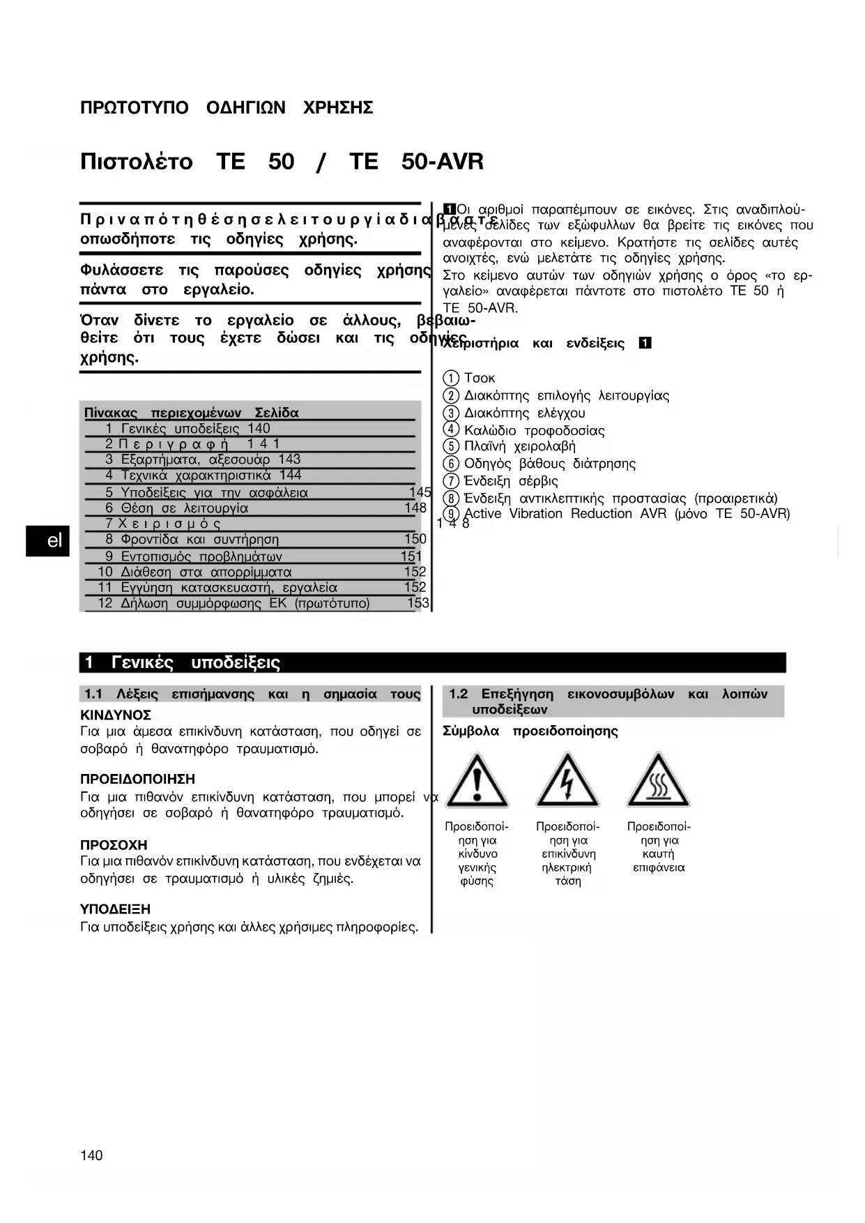 Πίνακας περιεχομένων Σελίδα1 Γενικές υποδείξεις 1402Περιγραφή 1413 Εξαρτήματα, αξεσουάρ 1434 Τεχνικά χαρακτηριστικά 1445 Υποδείξεις για την ασφάλεια 1456 Θέση σε λειτουργία 1487Χειρισμός 1488 Φροντίδα και συντήρηση 1509 Εντοπισμός προβλημάτων 15110 Διάθεση στα απορρίμματα 15211 Εγγύηση κατασκευαστή, εργαλεία 15212 Δήλωση συμμόρφωσης ΕΚ (πρωτότυπο) 1531 Οι αριθμοί παραπέμπουν σε εικόνες. Στις αναδιπλού-μενες σελίδες των εξώφυλλων θα βρείτε τις εικόνες πουαναφέρονται στο κείμενο. Κρατήστε τις σελίδες αυτέςανοιχτές, ενώ μελετάτε τις οδηγίες χρήσης.Στο κείμενο αυτών των οδηγιών χρήσης ο όρος «το ερ- γαλείο» αναφέρεται πάντοτε στο πιστολέτο TE 50 ή ΤΕ 50-AVR.Χειριστήρια και ενδείξεις 1