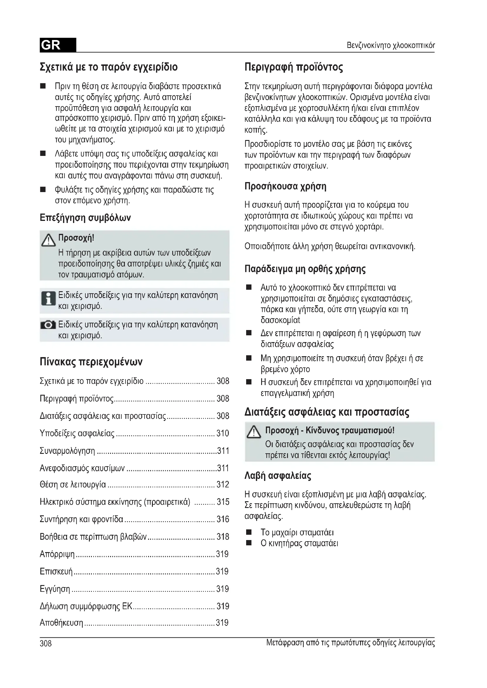 - Βενζινοκίνητο χλοοκοπτικόr Πίνακας περιεχομένων Σχετικά με το παρόν εγχειρίδιο p. 308