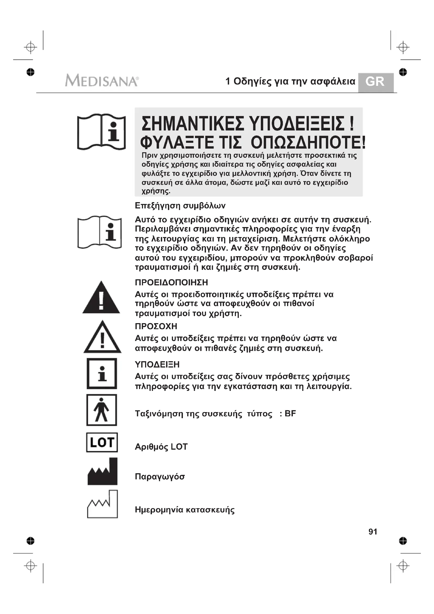 Αριθµός LOTΠαραγωγόσ Ηµεροµηνία κατασκευήςΤαξινόμηση της συσκευής τύπος : BF ΣΗΜΑΝΤΙΚΕΣ ΥΠΟΔΕΙΞΕΙΣ ! ΦΥΛΑΞΤΕ ΤΙΣ ΟΠΩΣΔΗΠΟΤΕ! Αυτό το εγχειρίδιο οδηγιών ανήκει σε αυτήν τη συσκευή. Περιλαμβάνει σημαντικές πληροφορίες για την έναρξη της λειτουργίας και τη μεταχείριση. Μελετήστε ολόκληρο το εγχειρίδιο οδηγιών. Αν δεν τηρηθούν οι οδηγίες αυτού του εγχειριδίου, μπορούν να προκληθούν σοβαροί τραυματισμοί ή και ζημιές στη συσκευή. ΠΡΟΕΙΔΟΠΟΙΗΣΗ Αυτές οι προειδοποιητικές υποδείξεις πρέπει να τηρηθούν ώστε να αποφευχθούν οι πιθανοί τραυματισμοί του χρήστη.ΠΡΟΣΟΧΗ Αυτές οι υποδείξεις πρέπει να τηρηθούν ώστε να αποφευχθούν οι πιθανές ζημιές στη συσκευή. Αυτές οι υποδείξεις σας δίνουν πρόσθετες χρήσιμες πληροφορίες για την εγκατάσταση και τη λειτουργία. Πριν χρησιμοποιήσετε τη συσκευή μελετήστε προσεκτικά τις οδηγίες χρήσης και ιδιαίτερα τις οδηγίες ασφαλείας και φυλάξτε το εγχειρίδιο για μελλοντική χρήση. Όταν δίνετε τη συσκευή σε άλλα άτομα, δώστε μαζί και αυτό το εγχειρίδιο Επεξήγηση συμβόλωνχρήσης.1 Οδηγίες για την ασφάλεια