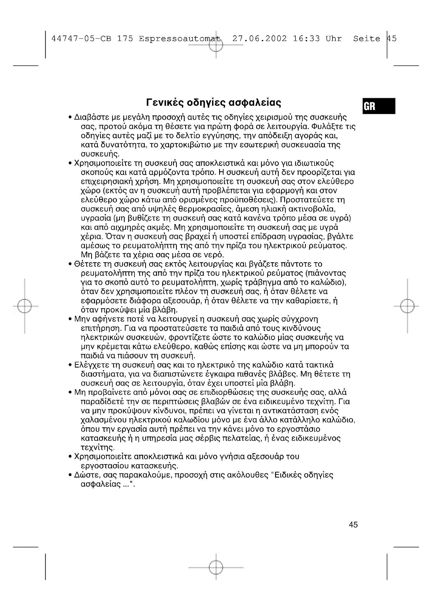 - ∆ώστε, σας παρακαλούµε, προσοχή στις ακλουθες "Ειδικές οδηγίες ασφαλείας ...". 44747-05-CB 175 Espressoautomat 27.06.2002 16:33 Uhr Seite 4546