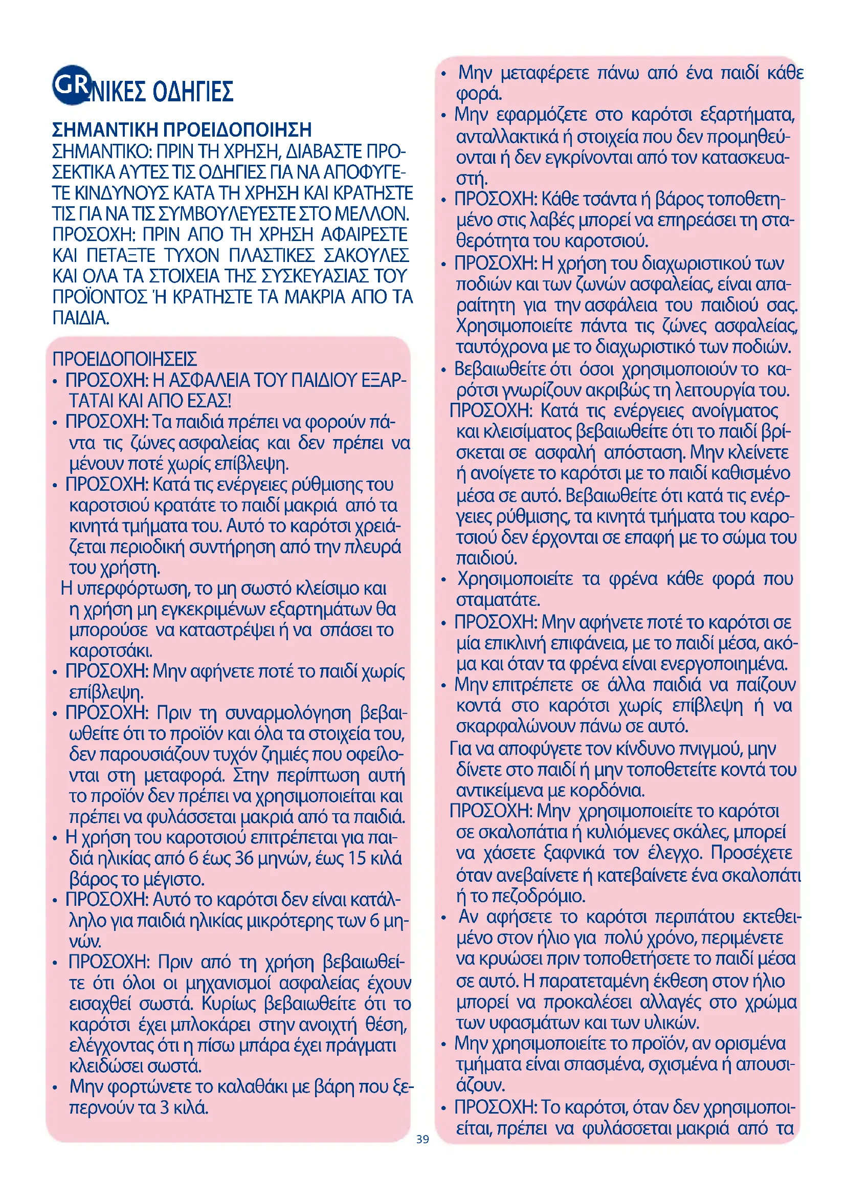 - ΠΡΟΣΟΧΗ: Κατά τις ενέργειες ρύθμισης του καροτσιού κρατάτε το παιδί μακριά από τα κινητά τμήματα του. Αυτό το καρότσι χρειά- ζεται περιοδική συντήρηση από την πλευρά του χρήστη. Η υπερφόρτωση, το μη σωστό κλείσιμο και η χρήση μη εγκεκριμένων εξαρτημάτων θα μπορούσε να καταστρέψει ή να σπάσει το