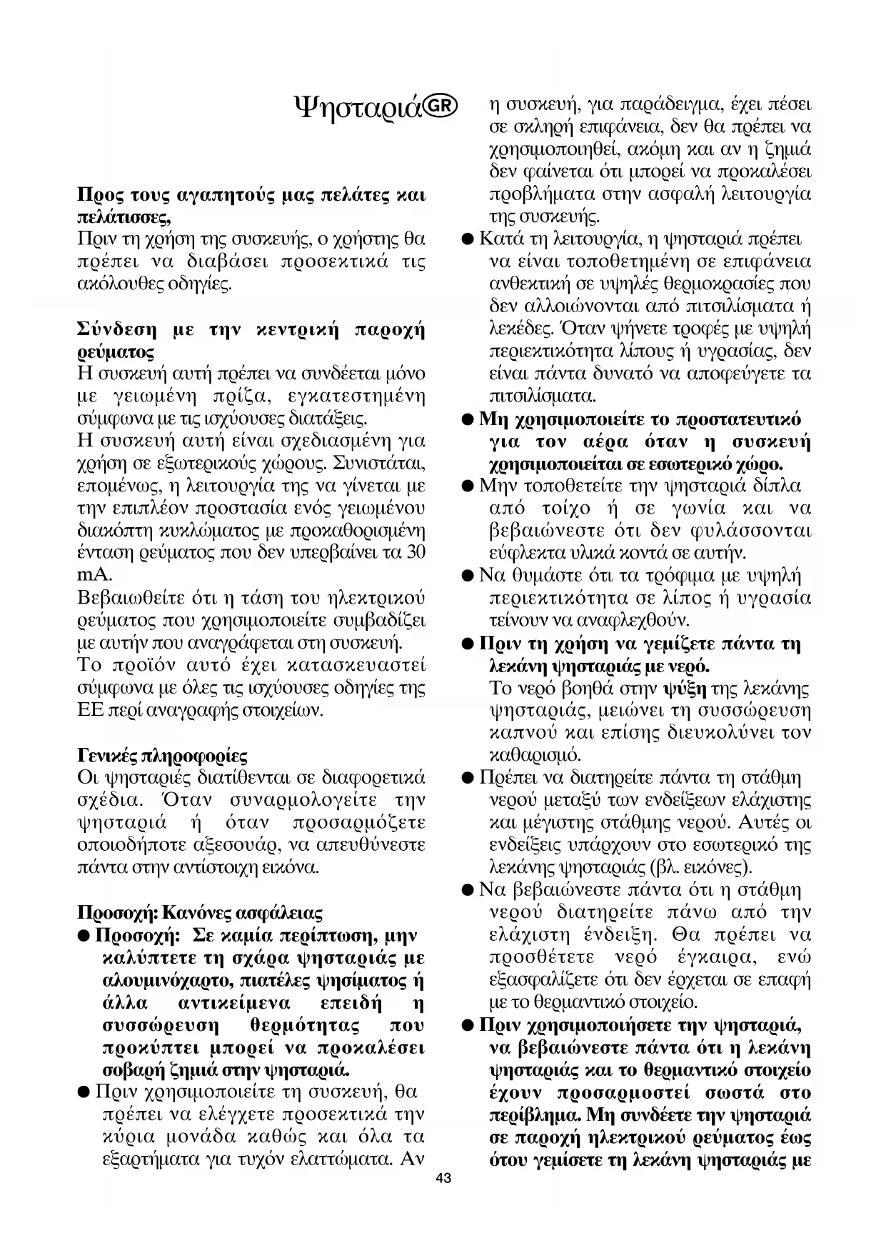 Η συσκευ αυτ πρπει να συνδεται μνο με γειωμνη πρζα, εγκατεστημνη σ!μφωνα με τις ισχ!ουσες διατξεις. Η συσκευ αυτ εναι σχεδιασμνη για χρση σε εξωτερικο!ς χ$ρους. Συνιστται, επομνως, η λειτουργα της να γνεται με την επιπλον προστασα ενς γειωμνου διακπτη κυκλ$ματος με προκαθορισμνη νταση ρε!ματος που δεν υπερβανει τα 30 mA. Βεβαιωθετε τι η τση του ηλεκτρικο! ρε!ματος που χρησιμοποιετε συμβαδζει με αυτν που αναγρφεται στη συσκευ. Το προϊν αυτ χει κατασκευαστε σ!μφωνα με λες τις ισχ!ουσες οδηγες της ΕΕ περ αναγραφς στοιχεων. Γενικς πληροφορες Οι ψησταρις διατθενται σε διαφορετικ σχδια. +ταν συναρμολογετε την ψησταρι ταν προσαρμζετε οποιοδποτε αξεσουρ, να απευθ!νεστε πντα στην αντστοιχη εικνα. Προσοχ: Καννες ασφλειας ● Προσοχ: Σε καμα περπτωση, μην καλπτετε τη σχρα ψησταρις με αλουμινχαρτο, πιατλες ψησματος λλα αντικεμενα επειδ η συσσ!ρευση θερμτητας που προκπτει μπορε να προκαλσει σοβαρ ζημι στην ψησταρι. ● Πριν χρησιμοποιετε τη συσκευ, θα πρπει να ελγχετε προσεκτικ την κ!ρια μονδα καθ$ς και λα τα εξαρτματα για τυχν ελαττ$ματα. Αν η συσκευ, για παρδειγμα, χει πσει σε σκληρ επιφνεια, δεν θα πρπει να χρησιμοποιηθε, ακμη και αν η ζημι δεν φανεται τι μπορε να προκαλσει προβλματα στην ασφαλ λειτουργα της συσκευς. ● Κατ τη λειτουργα, η ψησταρι πρπει να εναι τοποθετημνη σε επιφνεια ανθεκτικ σε υψηλς θερμοκρασες που δεν αλλοι$νονται απ πιτσιλσματα λεκδες. +ταν ψνετε τροφς με υψηλ περιεκτικτητα λπους υγρασας, δεν εναι πντα δυνατ να αποφε!γετε τα πιτσιλσματα. ● Μη χρησιμοποιετε το προστατευτικ για τον αρα ταν η συσκευ χρησιμοποιεται σε εσωτερικ χ!ρο. ● Μην τοποθετετε την ψησταρι δπλα απ τοχο σε γωνα και να βεβαι$νεστε τι δεν φυλσσονται ε!φλεκτα υλικ κοντ σε αυτν. ● Να θυμστε τι τα τρφιμα με υψηλ περιεκτικτητα σε λπος υγρασα τενουν να αναφλεχθο!ν. ● Πριν τη χρση να γεμζετε πντα τη λεκνη ψησταρις με νερ. Το νερ βοηθ στην ψξη της λεκνης ψησταρις, μει$νει τη συσσ$ρευση καπνο! και επσης διευκολ!νει τον