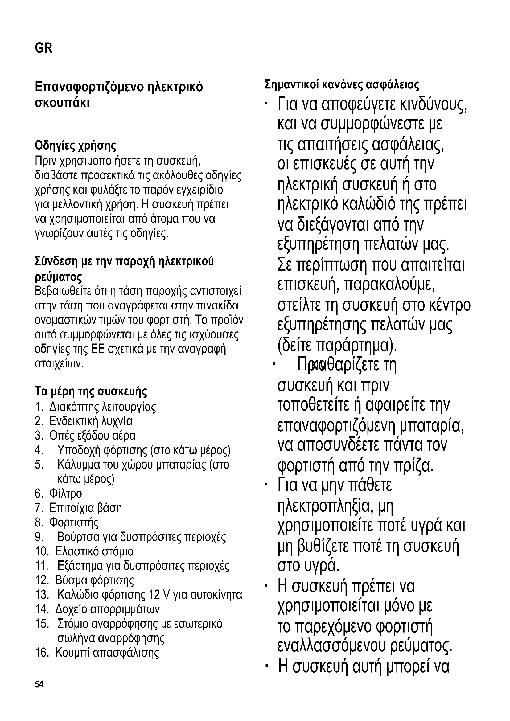 για τυχόν ελαττώματα. Αν η συσκευή, για παράδειγμα, έχει πέσει σε σκληρή επιφάνεια ή έχει ασκηθεί υπερβολική δύναμη για το τράβηγμα του ηλεκτρικού καλωδίου δεν θα πρέπει να χρησιμοποιηθεί ξανά, ακόμη κι αν η ζημιά δεν φαίνεται ότι μπορεί να προκαλέσει προβλήματα στην ασφαλή λειτουργία της συσκευής. ∙ Το ηλεκτρικό καλώδιο του φορτιστή δεν πρέπει να είναι τσακισμένο, και πρέπει να έχει δρομολογηθεί με τρόπο ώστε κανείς να μην μπορεί να σκοντάψει σε αυτό κατά λάθος. ∙ Μη χρησιμοποιείτε τη συσκευή για να μαζέψετε καυτές, όξινες ή εύφλεκτες ύλες. Μην επιχειρήσετε να μαζέψετε πολύ λεπτή σκόνη, όπως αλεύρι ή σκόνη