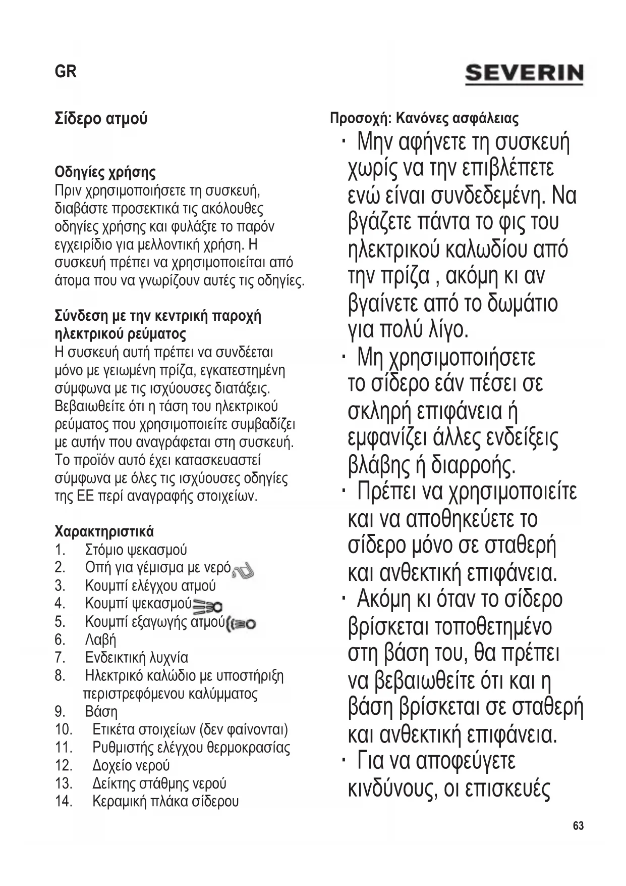 Προσοχή: Κανόνες ασφάλειας ∙ Μηναφήνετετησυσκευή χωρίςνατηνεπιβλέπετε ενώείναισυνδεδεμένη.Να βγάζετεπάντατοφιςτου ηλεκτρικούκαλωδίουαπό τηνπρίζα,ακόμηκιαν βγαίνετεαπότοδωμάτιο γιαπολύλίγο. ∙ Μηχρησιμοποιήσετε τοσίδεροεάνπέσεισε σκληρήεπιφάνειαή εμφανίζειάλλεςενδείξεις βλάβηςήδιαρροής. ∙ Πρέπειναχρησιμοποιείτε καινααποθηκεύετετο σίδερομόνοσεσταθερή καιανθεκτικήεπιφάνεια. ∙ Ακόμηκιόταντοσίδερο βρίσκεταιτοποθετημένο στηβάσητου,θαπρέπει ναβεβαιωθείτεότικαιη βάσηβρίσκεταισεσταθερή καιανθεκτικήεπιφάνεια. ∙ Γιανααποφεύγετε κινδύνους,οιεπισκευές GR64 104 x 142 mm σεαυτήτηνηλεκτρική συσκευήήστοηλεκτρικό καλώδιότηςπρέπεινα διεξάγονταιαπότην εξυπηρέτησηπελατών μας.Σεπερίπτωσηπου απαιτείταιεπισκευή, παρακαλούμε,στείλτε τησυσκευήστοκέντρο εξυπηρέτησηςπελατώνμας (δείτεπαράρτημα). ∙ Πρινκαθαρίσετετη συσκευή,βεβαιωθείτεότι είναιαποσυνδεδεμένηαπό τοηλεκτρικόρεύμακαιότι έχεικρυώσειεντελώς. ∙ Γιαναμηνπάθετε ηλεκτροπληξία,μη χρησιμοποιείτεποτένερό καιμηβυθίζετεποτέτη συσκευήστονερό. ∙ Πρινγεμίσετεξανάή αδειάσετετοδοχείοτου νερού,ναβγάζετεπάντοτε τησυσκευήαπότηνπρίζα. ∙ Ησυσκευήαυτήμπορεί ναχρησιμοποιηθείαπό παιδιά(τουλάχιστον8 ετών)καιαπόάτομα μεμειωμένεςφυσικές, αισθητήριεςήδιανοητικές ικανότητεςήχωρίς πείρακαιγνώσεις,με τηνπροϋπόθεσηότι επιτηρούνταιήτουςέχουν δοθείοδηγίεςσχετικάμε τηχρήσητηςσυσκευής καικατανοούνπλήρως όλουςτουςεμπλεκόμενους κίνδυνουςκαιπροφυλάξεις γιατηνασφάλεια. ∙ Ταπαιδιάδενπρέπεινα επιτρέπεταιναπαίζουνμε
