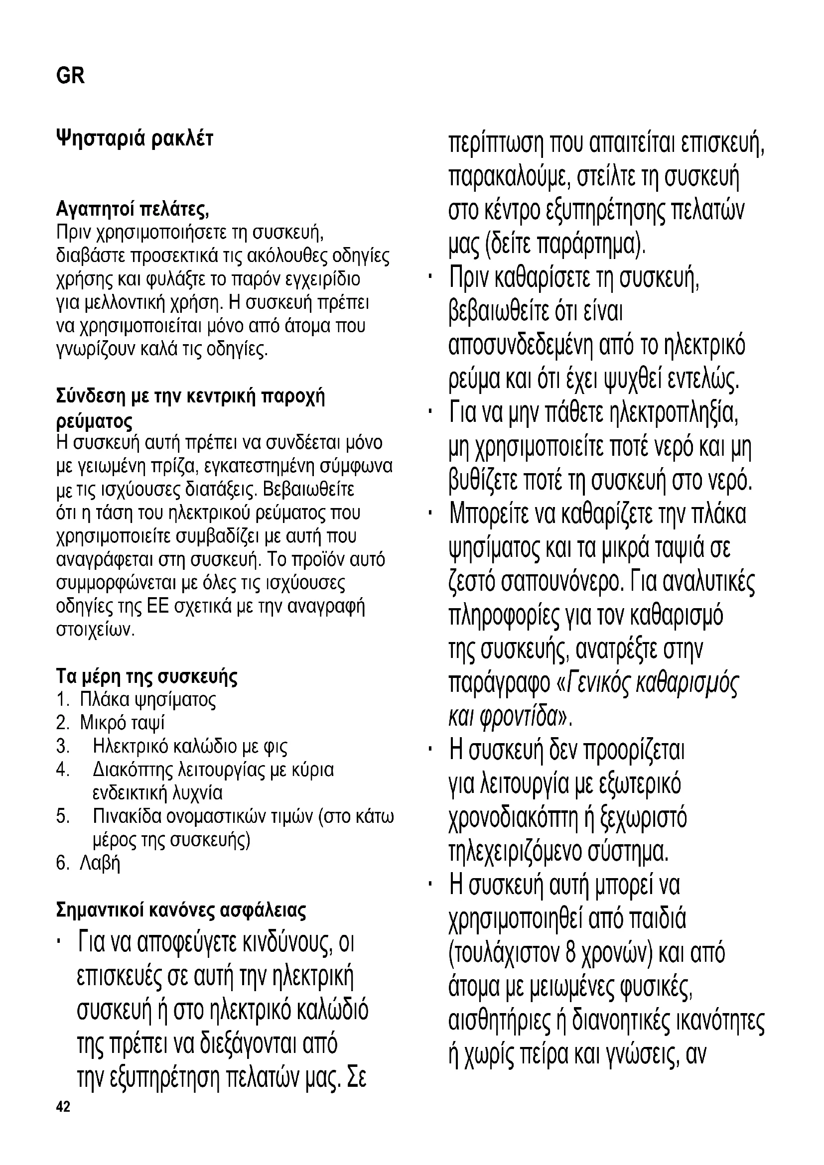 Σημαντικοί κανόνες ασφάλειας ∙ Για να αποφεύγετε κινδύνους, οι επισκευές σε αυτή την ηλεκτρική συσκευή ή στο ηλεκτρικό καλώδιό της πρέπει να διεξάγονται από την εξυπηρέτηση πελατών μας. Σε περίπτωση που απαιτείται επισκευή, παρακαλούμε, στείλτε τη συσκευή στο κέντρο εξυπηρέτησης πελατών μας (δείτε παράρτημα). ∙ Πριν καθαρίσετε τη συσκευή, βεβαιωθείτε ότι είναι αποσυνδεδεμένη από το ηλεκτρικό ρεύμα και ότι έχει ψυχθεί εντελώς. ∙ Για να μην πάθετε ηλεκτροπληξία, μη χρησιμοποιείτε ποτέ νερό και μη βυθίζετε ποτέ τη συσκευή στο νερό. ∙ Μπορείτε να καθαρίζετε την πλάκα ψησίματος και τα μικρά ταψιά σε ζεστό σαπουνόνερο. Για αναλυτικές πληροφορίες για τον καθαρισμό της συσκευής, ανατρέξτε στην παράγραφο «Γενικός καθαρισμός και φροντίδα». ∙ Η συσκευή δεν προορίζεται για λειτουργία με εξωτερικό χρονοδιακόπτη ή ξεχωριστό τηλεχειριζόμενο σύστημα. ∙ Η συσκευή αυτή μπορεί να χρησιμοποιηθεί από παιδιά (τουλάχιστον 8 χρονών) και από άτομα με μειωμένες φυσικές, αισθητήριες ή διανοητικές ικανότητες ή χωρίς πείρα και γνώσεις, αν GR43 επιτηρούνται ή τους έχουν δοθεί οδηγίες σχετικά με τη χρήση της συσκευής και κατανοούν πλήρως όλους τους εμπλεκόμενους κίνδυνους και προφυλάξεις για την