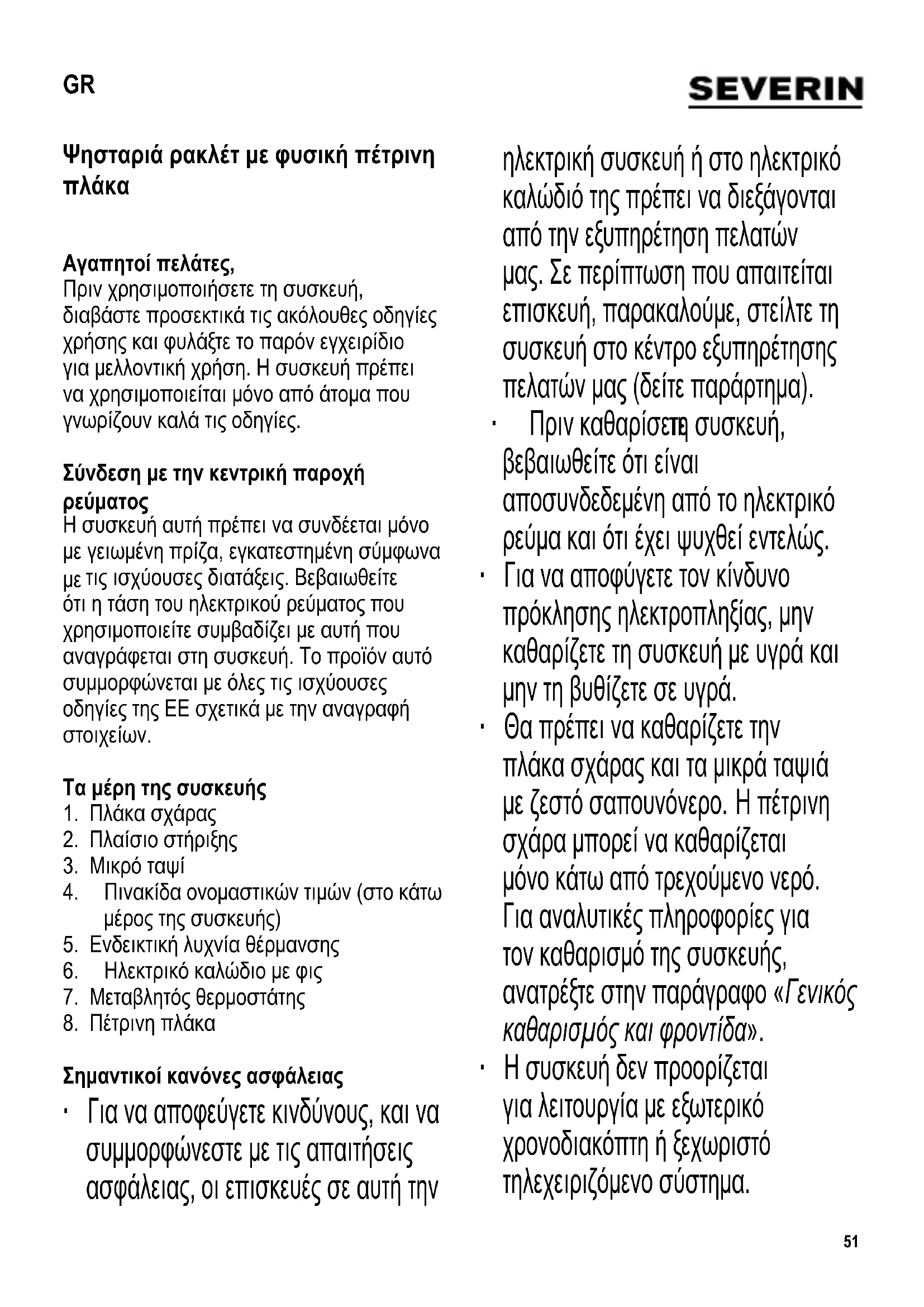 Σημαντικοί κανόνες ασφάλειας ∙ Για να αποφεύγετε κινδύνους, και να συμμορφώνεστε με τις απαιτήσεις ασφάλειας, οι επισκευές σε αυτή την ηλεκτρική συσκευή ή στο ηλεκτρικό καλώδιό της πρέπει να διεξάγονται από την εξυπηρέτηση πελατών μας. Σε περίπτωση που απαιτείται επισκευή, παρακαλούμε, στείλτε τη συσκευή στο κέντρο εξυπηρέτησης πελατών μας (δείτε παράρτημα). ∙ Πριν καθαρίσετε τη συσκευή, βεβαιωθείτε ότι είναι αποσυνδεδεμένη από το ηλεκτρικό ρεύμα και ότι έχει ψυχθεί εντελώς. ∙ Για να αποφύγετε τον κίνδυνο πρόκλησης ηλεκτροπληξίας, μην καθαρίζετε τη συσκευή με υγρά και μην τη βυθίζετε σε υγρά. ∙ Θα πρέπει να καθαρίζετε την πλάκα σχάρας και τα μικρά ταψιά με ζεστό σαπουνόνερο.