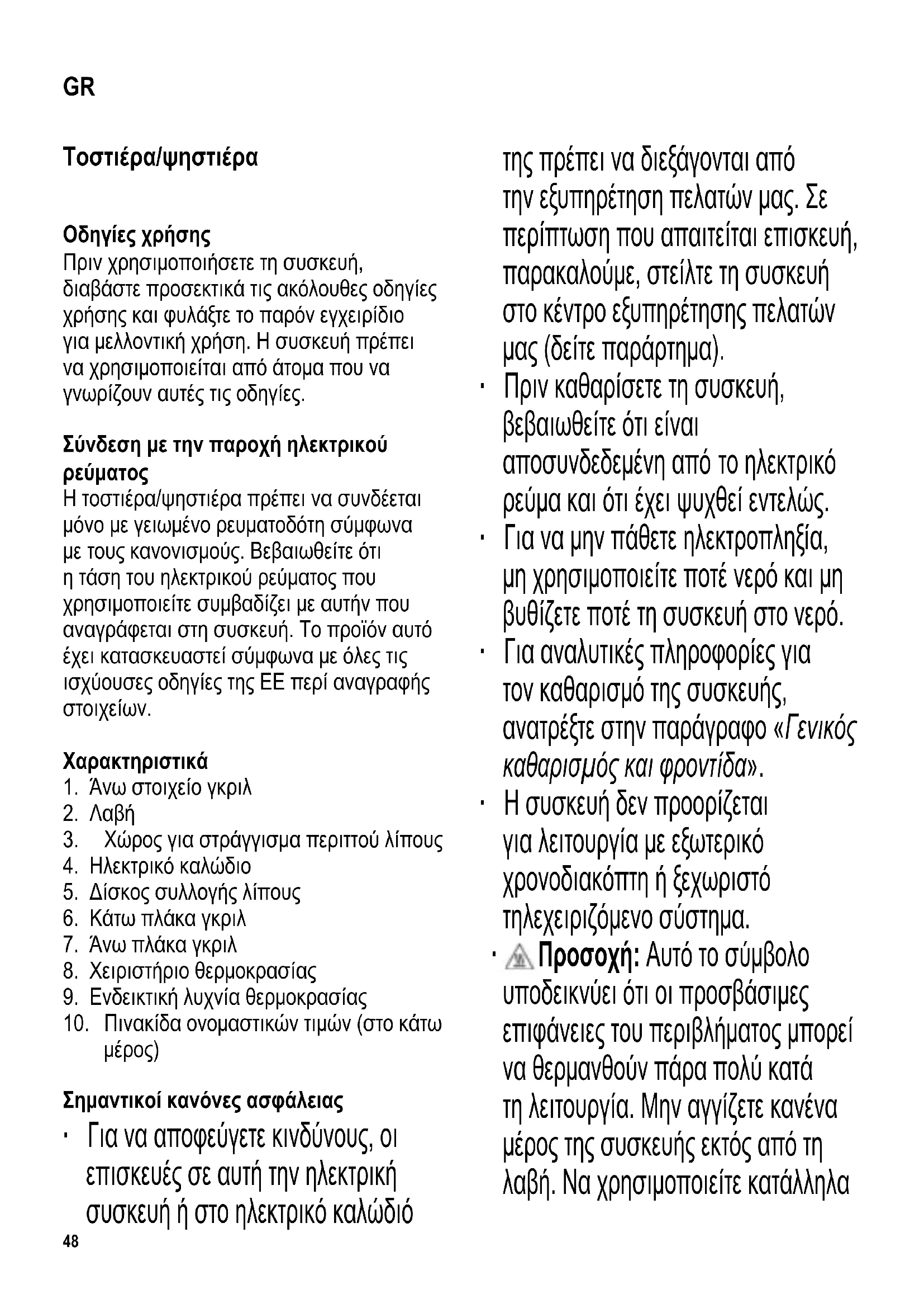 Προσοχή: Αυτό το σύμβολο υποδεικνύει ότι οι προσβάσιμες επιφάνειες του περιβλήματος μπορεί να θερμανθούν πάρα πολύ κατά τη λειτουργία. Μην αγγίζετε κανένα μέρος της συσκευής εκτός από τη λαβή. Να χρησιμοποιείτε κατάλληλα GR49 πανιά για φούρνο, εάν απαιτείται. ∙ Η συσκευή αυτή μπορεί να χρησιμοποιηθεί από παιδιά (τουλάχιστον 8 χρονών) και από άτομα με μειωμένες φυσικές, αισθητήριες ή διανοητικές ικανότητες ή χωρίς πείρα και γνώσεις, αν επιτηρούνται ή τους έχουν δοθεί οδηγίες σχετικά με τη χρήση της συσκευής και κατανοούν πλήρως όλους τους εμπλεκόμενους κίνδυνους και προφυλάξεις για την