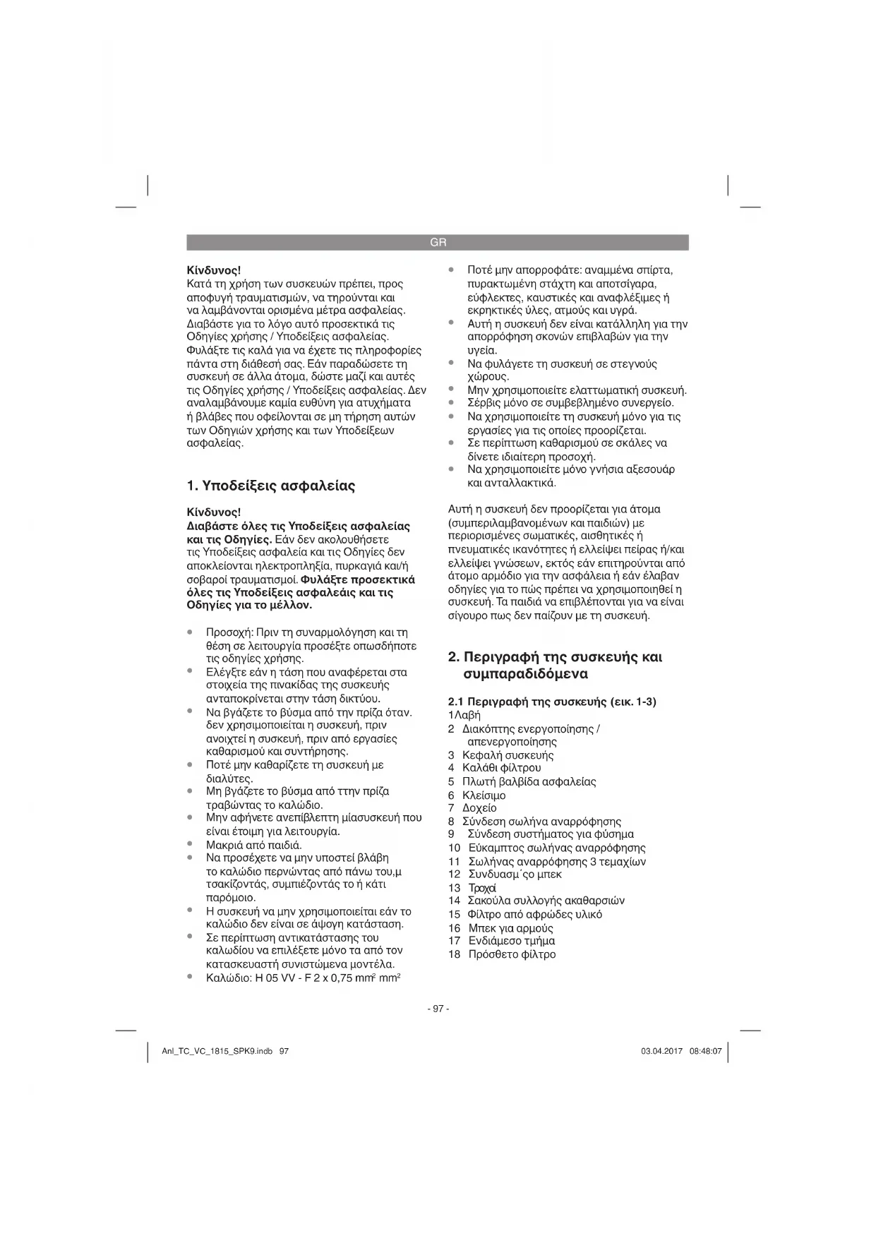 1 Λαβή 2 Διακόπτης ενεργοποίησης / απενεργοποίησης 3 Κεφαλή συσκευής 4 Καλάθι φίλτρου 5 Πλωτή βαλβίδα ασφαλείας 6 Κλείσιμο 7 Δοχείο 8 Σύνδεση σωλήνα αναρρόφησης 9 Σύνδεση συστήματος για φύσημα 10 Εύκαμπτος σωλήνας αναρρόφησης 11 Σωλήνας αναρρόφησης 3 τεμαχίων 12 Συνδυασμ΄ςο μπεκ 13 Τροχοί 14 Σακούλα συλλογής ακαθαρσιών 15 Φίλτρο από αφρώδες υλικό 16 Μπεκ για αρμούς 17 Ενδιάμεσο τμήμα 18 Πρόσθετο φίλτρο Anl_TC_VC_1815_SPK9.indb 97Anl_TC_VC_1815_SPK9.indb 97 03.04.2017 08:48:0703.04.2017 08:48:07GR