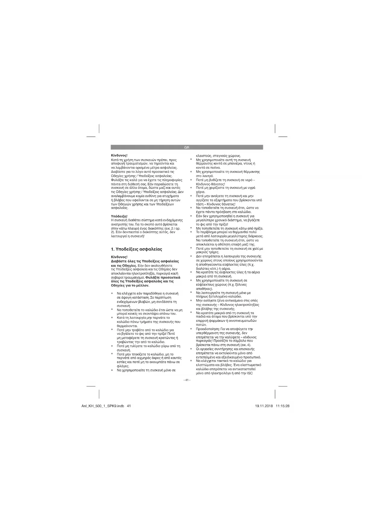 Να ελέγχεται τακτικά το καλώδιο για ελαττώματα και βλάβες. Ένα ελαττωματικό καλώδιο επιτρέπεται να αντικατασταθεί μόνο από ηλεκτρολόγο ή από την ISC Anl_KH_500_1_SPK9.indb 41Anl_KH_500_1_SPK9.indb 41 19.11.2018 11:15:2819.11.2018 11:15:28GR