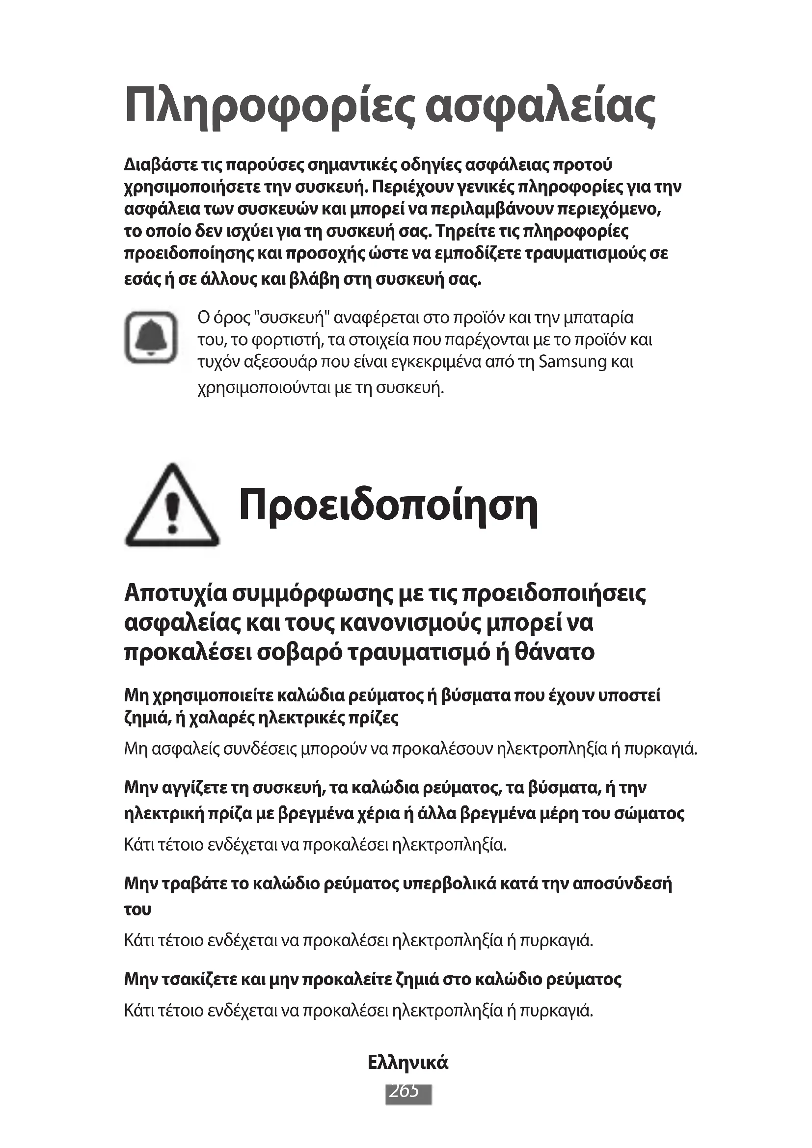 Πληροφορίες ασφαλείας Διαβάστε τις παρούσες σημαντικές οδηγίες ασφάλειας προτού χρησιμοποιήσετε την συσκευή. Περιέχουν γενικές πληροφορίες για την ασφάλεια των συσκευών και μπορεί να περιλαμβάνουν περιεχόμενο, το οποίο δεν ισχύει για τη συσκευή σας. Τηρείτε τις πληροφορίες προειδοποίησης και προσοχής ώστε να εμποδίζετε τραυματισμούς σε εσάς ή σε άλλους και βλάβη στη συσκευή σας.Ο όρος "συσκευή" αναφέρεται στο προϊόν και την μπαταρία του, το φορτιστή, τα στοιχεία που παρέχονται με το προϊόν και τυχόν αξεσουάρ που είναι εγκεκριμένα από τη Samsung και χρησιμοποιούνται με τη συσκευή. Προειδοποίηση Αποτυχία συμμόρφωσης με τις προειδοποιήσεις ασφαλείας και τους κανονισμούς μπορεί να προκαλέσει σοβαρό τραυματισμό ή θάνατο Μη χρησιμοποιείτε καλώδια ρεύματος ή βύσματα που έχουν υποστεί ζημιά, ή χαλαρές ηλεκτρικές πρίζεςΜη ασφαλείς συνδέσεις μπορούν να προκαλέσουν ηλεκτροπληξία ή πυρκαγιά.Μην αγγίζετε τη συσκευή, τα καλώδια ρεύματος, τα βύσματα, ή την ηλεκτρική πρίζα με βρεγμένα χέρια ή άλλα βρεγμένα μέρη του σώματοςΚάτι τέτοιο ενδέχεται να προκαλέσει ηλεκτροπληξία.Μην τραβάτε το καλώδιο ρεύματος υπερβολικά κατά την αποσύνδεσή Κάτι τέτοιο ενδέχεται να προκαλέσει ηλεκτροπληξία ή πυρκαγιά.Μην τσακίζετε και μην προκαλείτε ζημιά στο καλώδιο ρεύματοςΚάτι τέτοιο ενδέχεται να προκαλέσει ηλεκτροπληξία ή πυρκαγιά.Ελληνικά