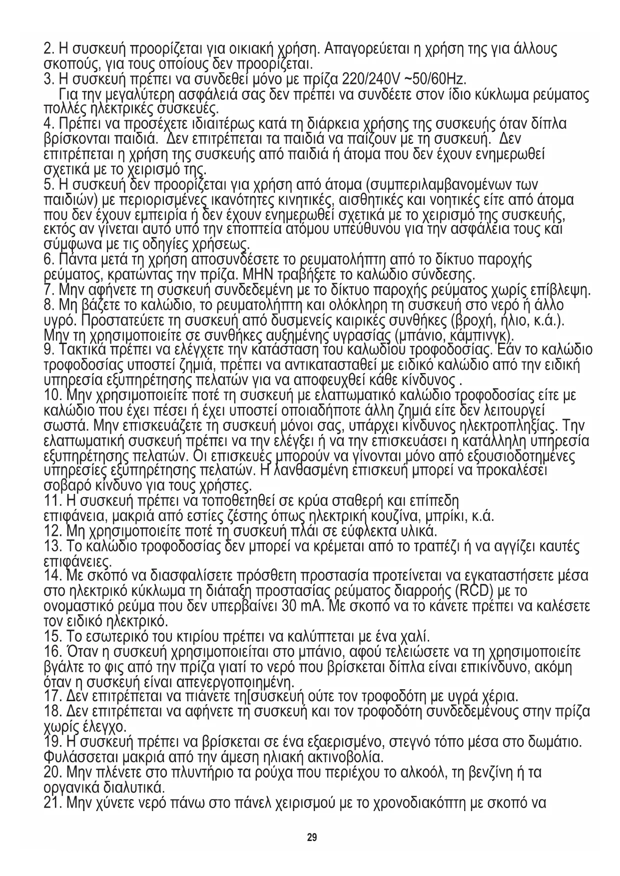 21. Μην χύνετε νερό πάνω στο πάνελ χειρισμού με το χρονοδιακόπτη με σκοπό να