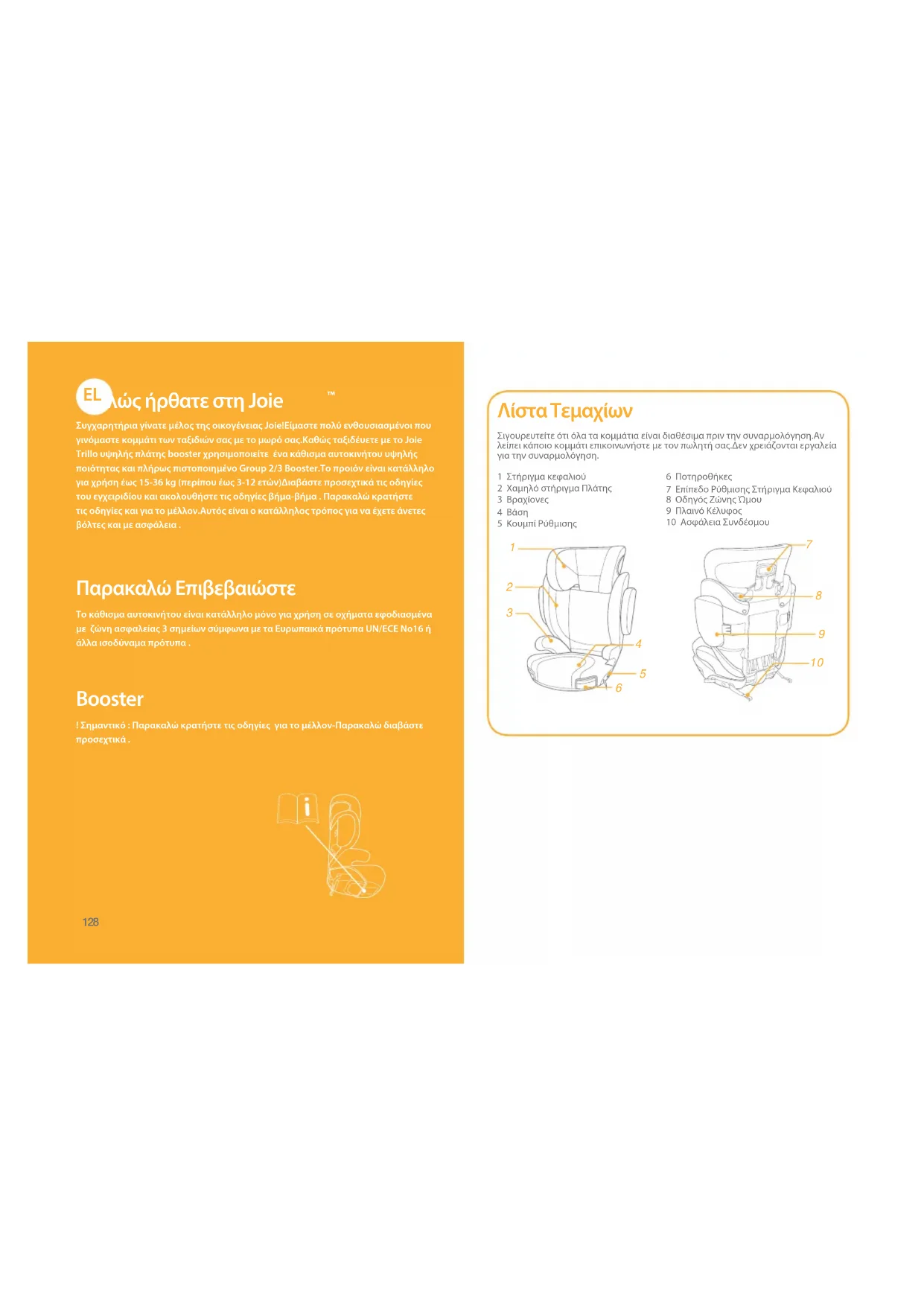 Συγχαρητήρια γίνατε μέλος της οικογένειας Joie!Είμαστε πολύ ενθουσιασμένοι που γινόμαστε κομμάτι των ταξιδιών σας με το μωρό σας.Καθώς ταξιδέυετε με το Joie Trillo υψηλής πλάτης booster χρησιμοποιείτε ένα κάθισμα αυτοκινήτου υψηλής ποιότητας και πλήρως πιστοποιημένο Group 2/3 Booster.Το προιόν είναι κατάλληλο για χρήση έως 15-36 kg (περίπου έως 3-12 ετών)Διαβάστε προσεχτικά τις οδηγίες του εγχειριδίου και ακολουθήστε τις οδηγίες βήμα-βήμα . Παρακαλώ κρατήστε τις οδηγίες και για το μέλλον.Aυτός είναι ο κατάλληλος τρόπος για να έχετε άνετες βόλτες και με ασφάλεια . Παρακαλώ Επιβεβαιώστε Το κάθισμα αυτοκινήτου είναι κατάλληλο μόνο για χρήση σε οχήματα εφοδιασμένα με ζώνη ασφαλείας 3 σημείων σύμφωνα με τα Ευρωπαικά πρότυπα UN/ECE No16 ή άλλα ισοδύναμα πρότυπα . Βooster ! Σημαντικό : Παρακαλώ κρατήστε τις οδηγίες για το μέλλον-Παρακαλώ διαβάστε προσεχτικά .