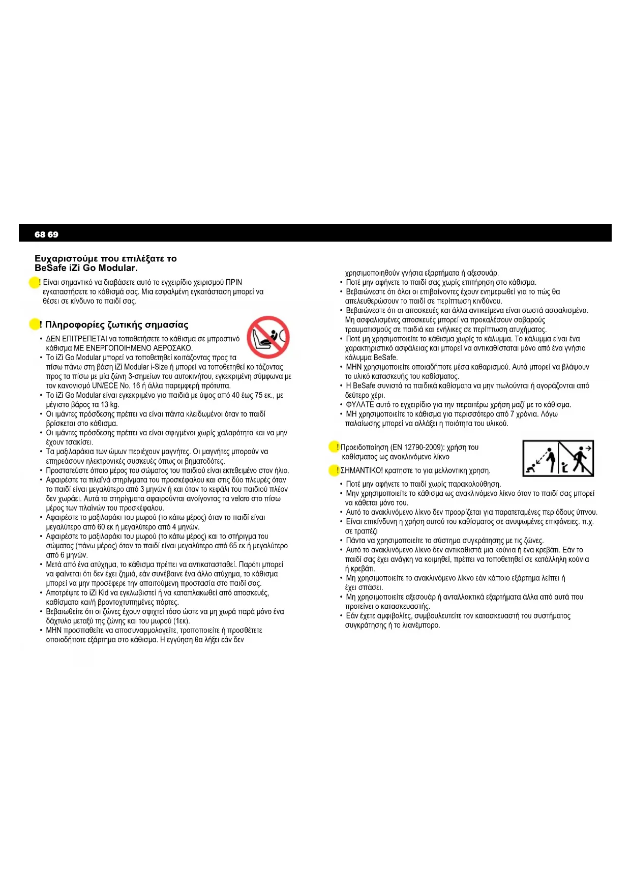 - ΜΗΝ προσπαθείτε να αποσυναρμολογείτε, τροποποιείτε ή προσθέτετε οποιοδήποτε εξάρτημα στο κάθισμα. Η εγγύηση θα λήξει εάν δεν Ευχαριστούμε που επιλέξατε το BeSafe iZi Go Modular. ! Είναι σημαντικό να διαβάσετε αυτό το εγχειρίδιο χειρισμού ΠΡΙΝ εγκαταστήσετε το κάθισμά σας. Μια εσφαλμένη εγκατάσταση μπορεί να θέσει σε κίνδυνο το παιδί σας. χρησιμοποιηθούν γνήσια εξαρτήματα ή αξεσουάρ.