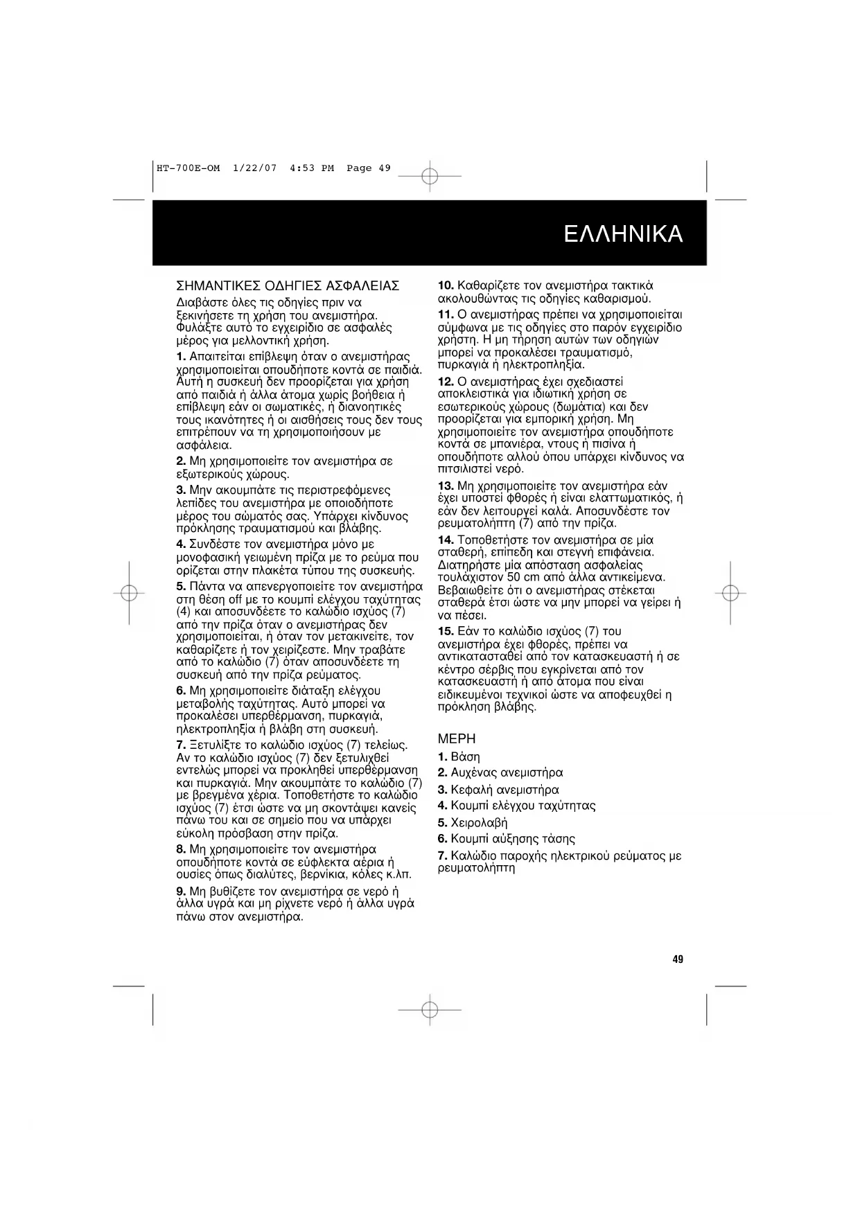 РУCCKИЙ HT-700E-OM 1/22/07 4:53 PM Page 4849 ΣΗΜΑΝΤΙΚΕΣ ΟΔΗΓΙΕΣ ΑΣΦΑΛΕΙΑΣ Διαβάστε όλες τις οδηγίες πριν να ξεκινήσετε τη χρήση του ανεμιστήρα. Φυλάξτε αυτό το εγχειρίδιο σε ασφαλές μέρος για μελλοντική χρήση.