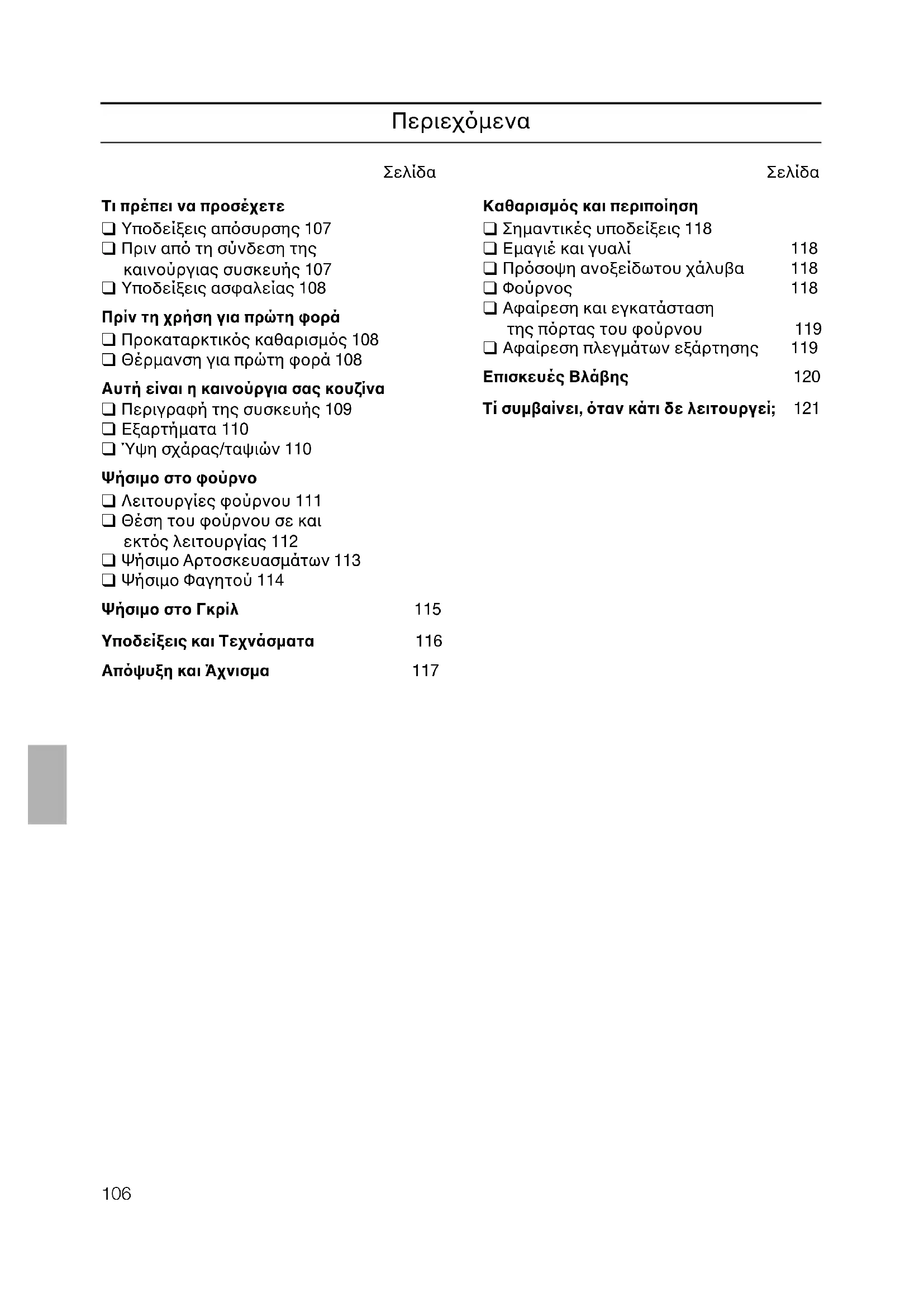 Tι πρέπει να προσέχετε ❑ Υποδείξεις απσυρσης 107 ❑ Πριν απ τη σύνδεση της καινούργιας συσκευής 107 ❑ Yποδείξεις ασφαλείας 108 Πρίν τη χρήση για πρώτη φορά ❑ Προκαταρκτικς καθαρισµς 108 ❑ Θέρµανση για πρώτη φορά 108 Aυτή είναι η καινούργια σας κουζίνα ❑ Περιγραφή της συσκευής 109 ❑ Eξαρτήµατα 110 ❑ Ύψη σχάρας/ταψιών 110 Ψήσιµο στο φούρνο ❑ Λειτουργίες φούρνου 111 ❑ Θέση του φούρνου σε και εκτς λειτουργίας 112 ❑ Ψήσιµο Aρτοσκευασµάτων 113 ❑ Ψήσιµο Φαγητού 114 Ψήσιµο στο Γκρίλ 115 Yποδείξεις και Tεχνάσµατα 116 Aπψυξη και Άχνισµα 117
