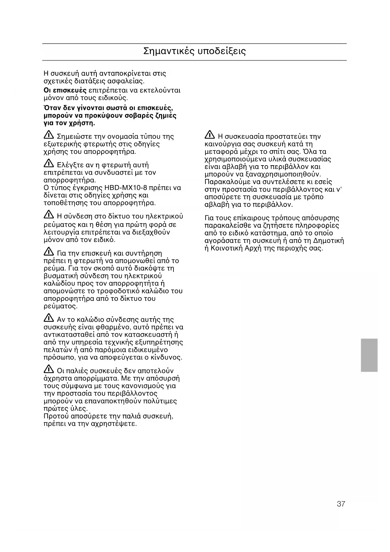 turbina para o exaustor. Por questão de segurança, a protecção adicional na ficha tem que estar sempre colocada e ligada.37 Σηµαντικές υποδείξεις Η συσκευή αυτή ανταποκρίνεται στις σχετικές διατάξεις ασφαλείας. Οι επισκευές επιτρέπεται να εκτελούνται µνον απ τους ειδικούς. ταν δεν γίνονται σωστά οι επισκευές, µπορούν να προκύψουν σοβαρές ζηµιές για τον χρήστη. Σηµειώστε την ονοµασία τύπου της εξωτερικής φτερωτής στις οδηγίες χρήσης του απορροφητήρα. Ελέγξτε αν η φτερωτή αυτή επιτρέπεται να συνδυαστεί µε τον απορροφητήρα. Ο τύπος έγκρισης HBD-MX10-8 πρέπει να δίνεται στις οδηγίες χρήσης και τοποθέτησης του απορροφητήρα. Η σύνδεση στο δίκτυο του ηλεκτρικού ρεύµατος και η θέση για πρώτη φορά σε λειτουργία επιτρέπεται να διεξαχθούν µνον απ τον ειδικ. Γι α την επισκευή και συντήρηση πρέπει η φτερωτή να αποµονωθεί απ το ρεύµα. Για τον σκοπ αυτ διακψτε τη βυσµατική σύνδεση του ηλεκτρικού καλώδίου προς τον απορροφητήτα ή αποµονώστε το τροφοδοτικ καλώδιο του απορροφητήρα απ το δίκτυο του
