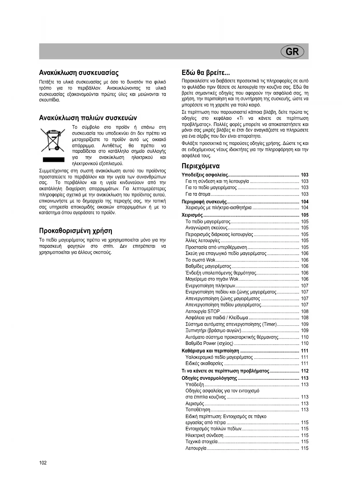 - Ανακύκλωση παλιών συσκευών Το σύµβολο στο προϊόν ή επάνω στη συσκευασία του υποδεικνύει ότι δεν πρέπει να µεταχειρίζεστε το προϊόν αυτό ως οικιακό απόρριµµα. Αντιθέτως θα πρέπει να παραδίδεται στο κατάλληλο σηµείο συλλογής για την ανακύκλωση ηλεκτρικού και ηλεκτρονικού εξοπλισµού. Συµµετέχοντας στη σωστή ανακύκλωση αυτού του προϊόντος προστατεύετε το περιβάλλον και την υγεία των συνανθρώπων σας. Το περιβάλλον και η υγεία κινδυνεύουν από την ακατάλληλη διαχείριση απορριµµάτων. Για λεπτοµερέστερες πληροφορίες σχετικά µε την ανακύκλωση του προϊόντος αυτού, επικοινωνήστε µε το δηµαρχείο της περιοχής σας, την τοπική σας υπηρεσία αποκοµιδής οικιακών απορριµµάτων ή µε το κατάστηµα όπου αγοράσατε το προϊόν. Προκαθορισµένη χρήση Το πεδίο µαγειρέµατος πρέπει να χρησιµοποιείται µόνο για την παρασκευή φαγητών στο σπίτι. ∆εν επιτρέπεται να χρησιµοποιείται για άλλους σκοπούς. Εδώ θα βρείτε